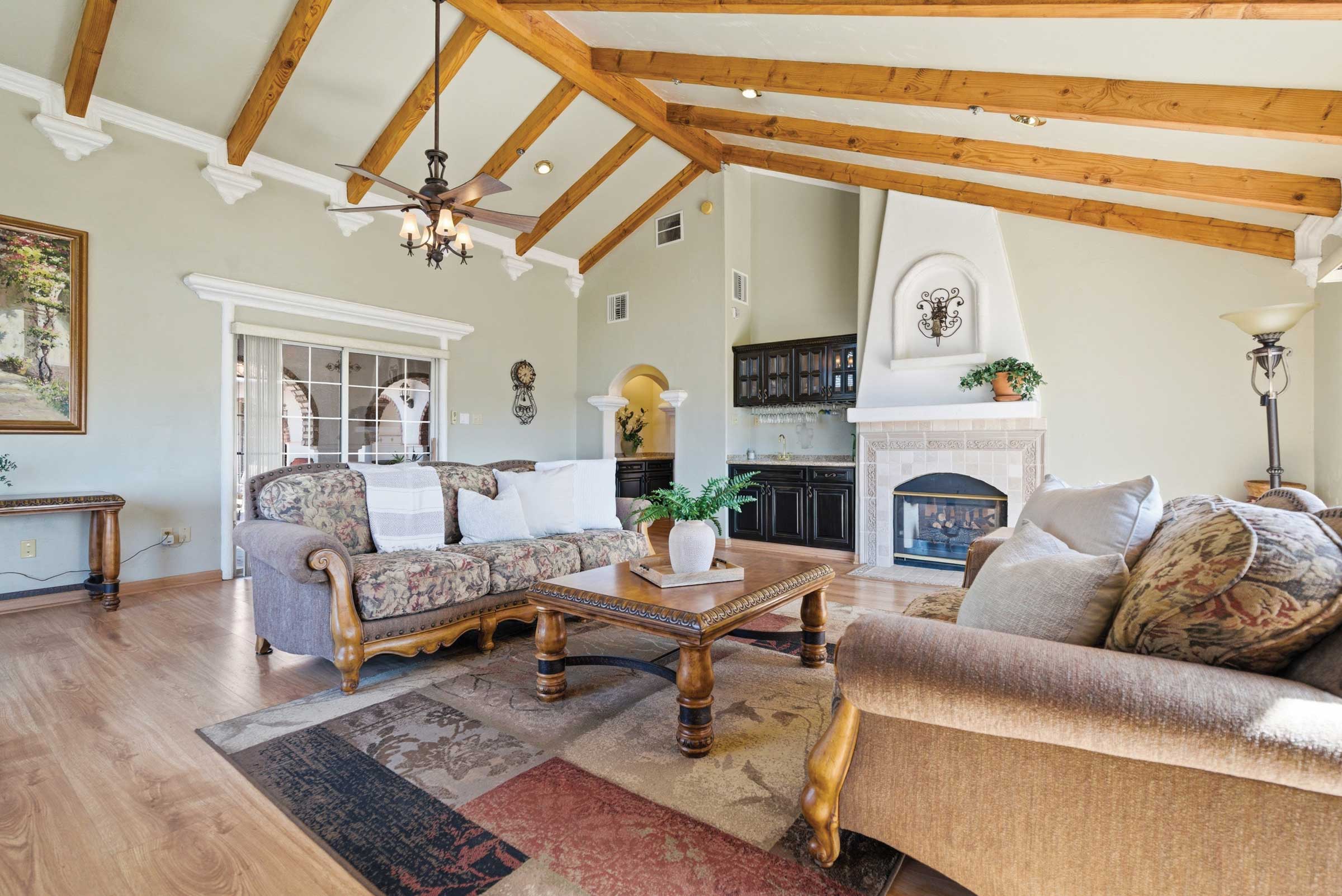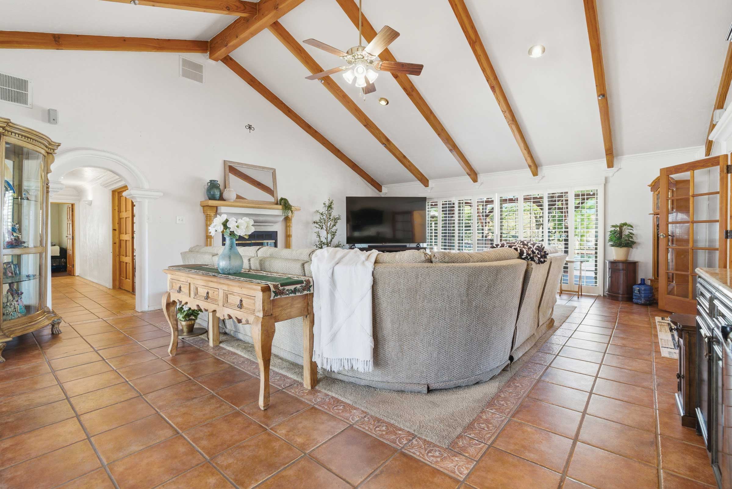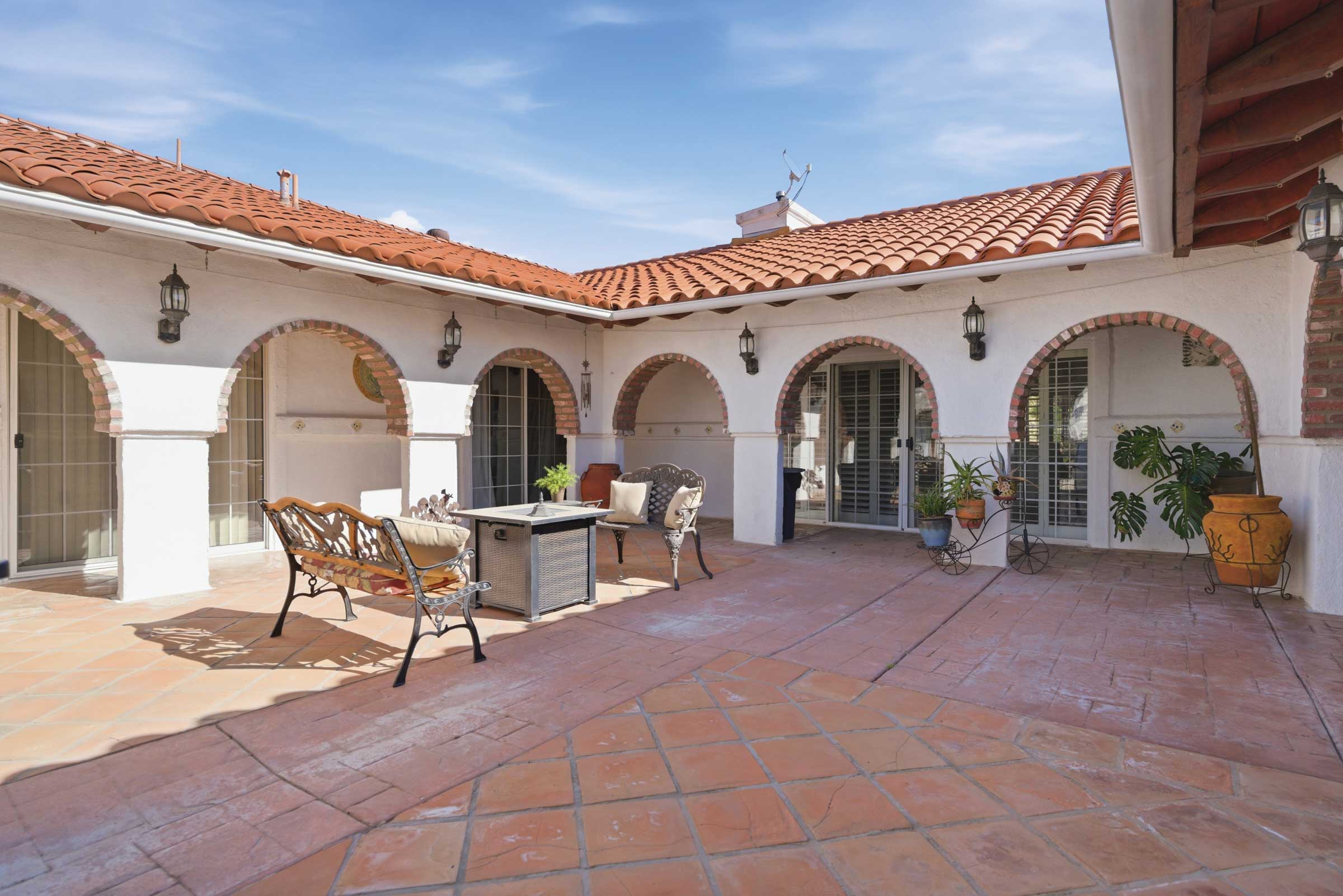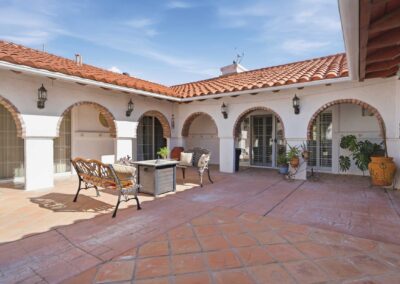 One of the property’s most inviting features is its private courtyard, a hallmark of classic hacienda design. This serene outdoor space enhances the connection between indoor and outdoor living, providing a perfect setting for quiet mornings, gatherings with friends, or simply enjoying the Southern California climate.