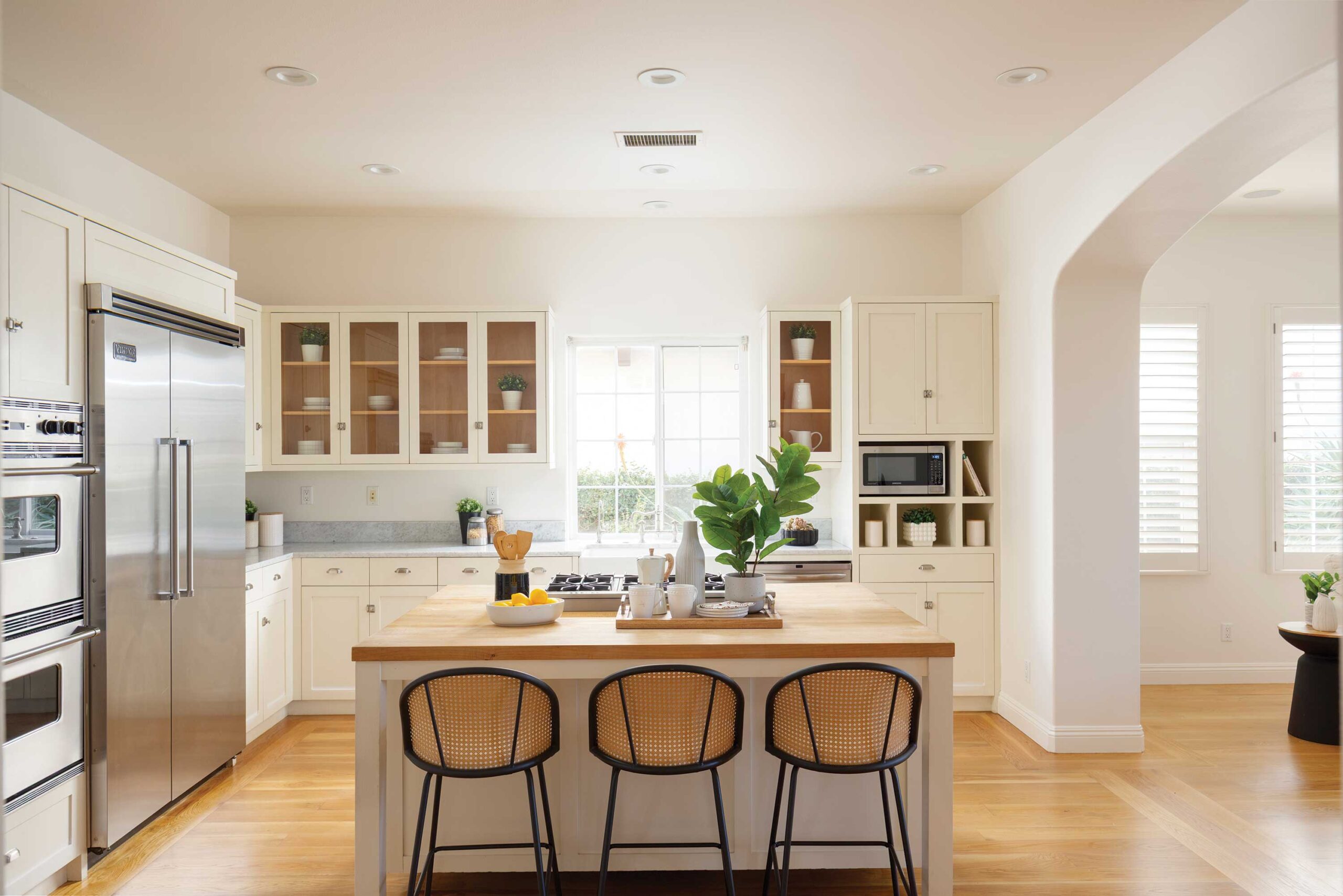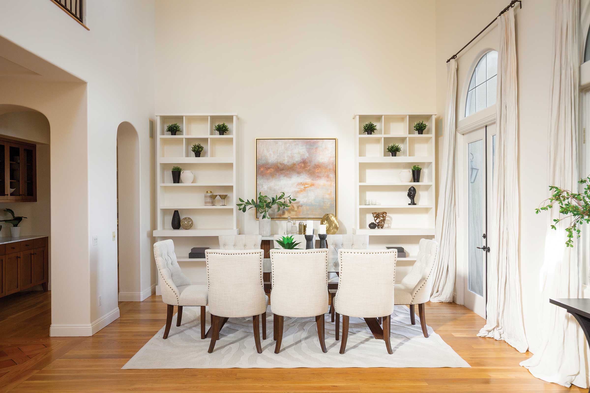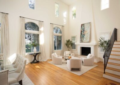 Inside, timeless finishes set the tone. Freshly painted interiors, warm wood flooring, and beautifully updated kitchen and bathrooms create a cohesive aesthetic that feels both refined and welcoming. The main living space is especially striking, with soaring double-height ceilings and expansive windows that frame verdant landscaping and sweeping views beyond. Natural light fills the room, highlighting the fireplace, custom built-in bookcases, and seamless connection to the outdoors through double doors.