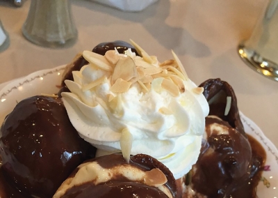 dulcey bavarian, milk chocolate ice cream, honey hazelnut nougat, chocolate sauce, dulcet crisp