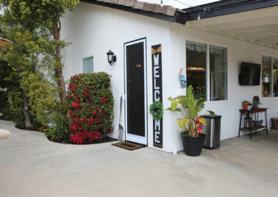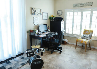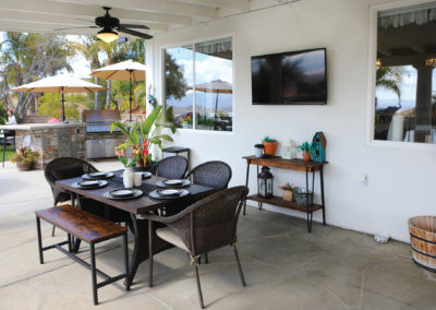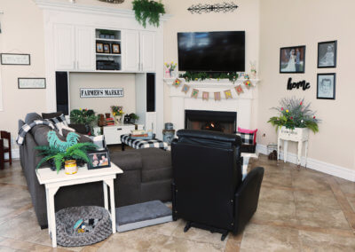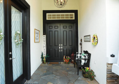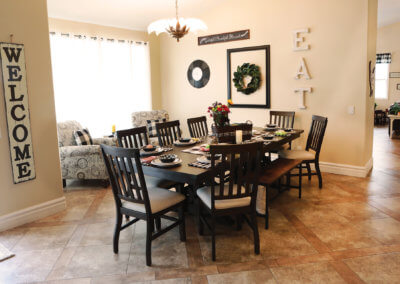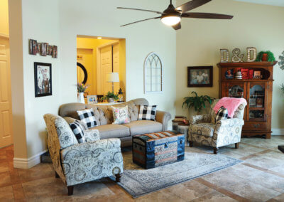 Sitting at the end of a private driveway, there is plenty of parking space for big family functions. It also contains a gated RV parking area and 3-car garage. The front of the home is lush with a manicured lawn and shrubs with a stoned walkway. Walking through the front entryway to the front door, the homeowners use similar decorations as a hint of what the rest of the home will look like. The entry has enough space for an outdoor sitting area to enjoy in the early mornings or late afternoons. As you walk through the front door you are met with an open living concept with many windows to allow natural lighting to fill the home. With light tile flooring and cream walls the space seems even larger, the homeowners chose to add hints of dark wood furniture to contrast with the floor and walls while providing subtle ways to draw your eyes to the various spaces.