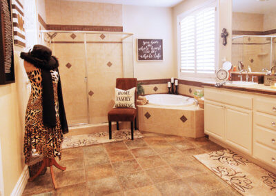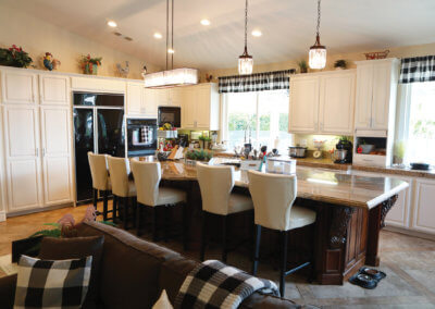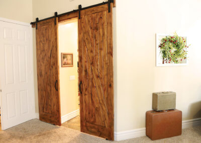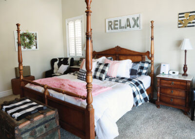 One feature that truly makes this house grand is the layout of the master suite from the guest rooms with both being on opposite ends of the home. When designing the guest rooms, the homeowners made sure to have dedicated rooms for the grandchildren and all of their toys, but throughout the home you will find small tables, chairs and things to keep the little ones entertained while the adults are hanging out. The remaining rooms are used as an office/music room with white finishes and custom built-ins and a guest bedroom. The master suite combines a unique mixture of traditional farmhouse with chestnut wood furniture, antique trunks and suitcases, and barn doors leading to the master bathroom.