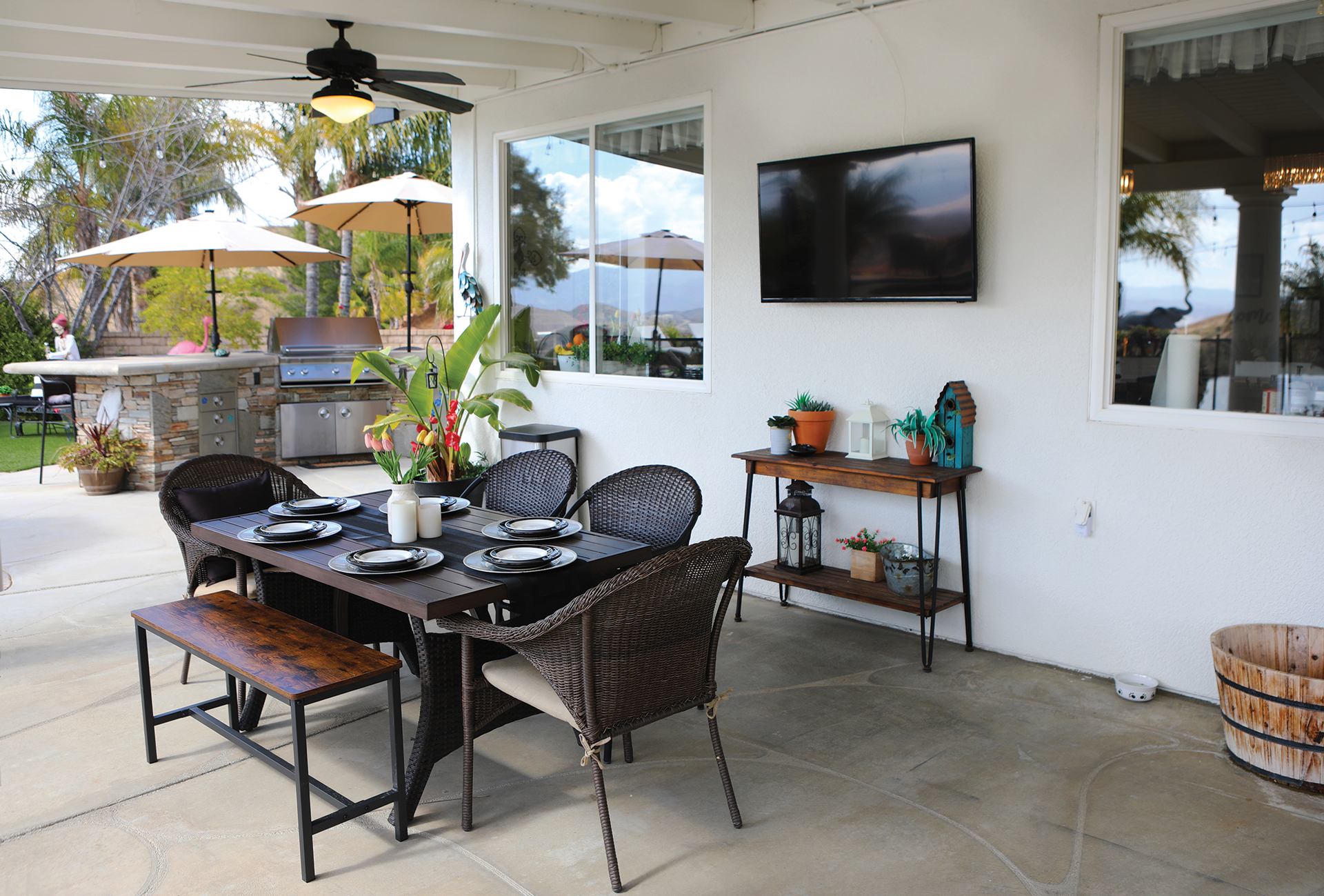 Located in Castaic, this issue’s million-dollar home boasts space, breath-taking views and is an entertainer’s dream. This home has over 3,000 square feet of living space on a nearly 14-acre lot that backs up to mountain views. Owned by the Bennett Family, they have created a cozy welcoming environment for their children, grandchildren and friends. Far from being the typical grandparents home with doilies and plastic on the furniture, the homeowners have designed a modern approach, where throughout the home you will find upscale farmhouse décor, buffalo plaid accents and high-end fixtures.