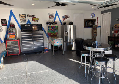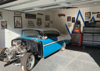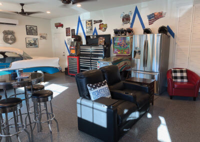 The homeowners have turned the garage into the perfect mancave. It is fit with tool boxes, a hang-out area to enjoy with family and friends and classic cars. This retro inspired man cave completes the home aesthetic.