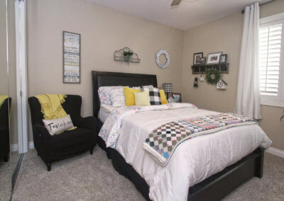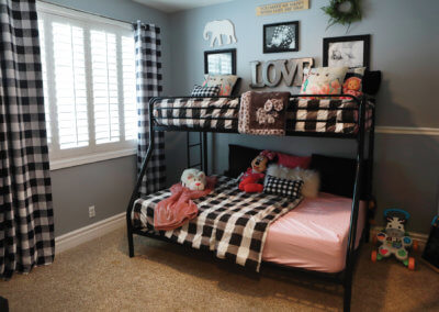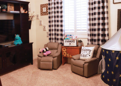Immediately to the left of the entryway is a formal living area that opens up to the formal dining. This wide-open space continues with chic farmhouse décor, a large dining table to fit their growing family and accent chairs with antique clock patterns and buffalo plaid throw pillows to really add flair to the space. To the right of the entryway, is the expansive kitchen with a large island that can fit five adults seated. The kitchen overlooks the family room that is equipped with a big screen tv and fireplace making for a cozy entertainment spot all-year round. Throughout the living spaces, the windows allow you to overlook the backyard which makes this home an entertainer’s dream.