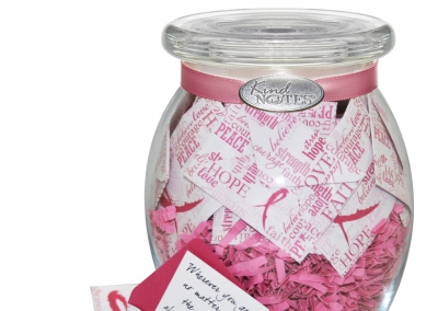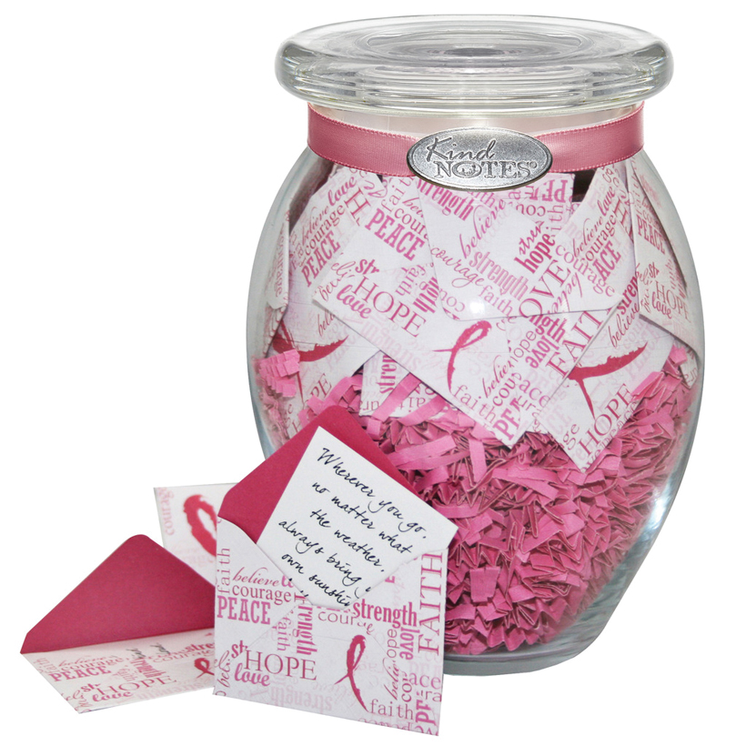 Send a beautiful jar of KindNotes to someone fighting cancer to give them strength and courage. KindNotes Pink Ribbon jar contains 31 messages of words of inspiration and encouragement, enclosed in mini decorative envelopes for the recipient to open each day or anytime they need a smile. Twenty percent of proceeds will be donated to organizations dedicated to finding a cure.