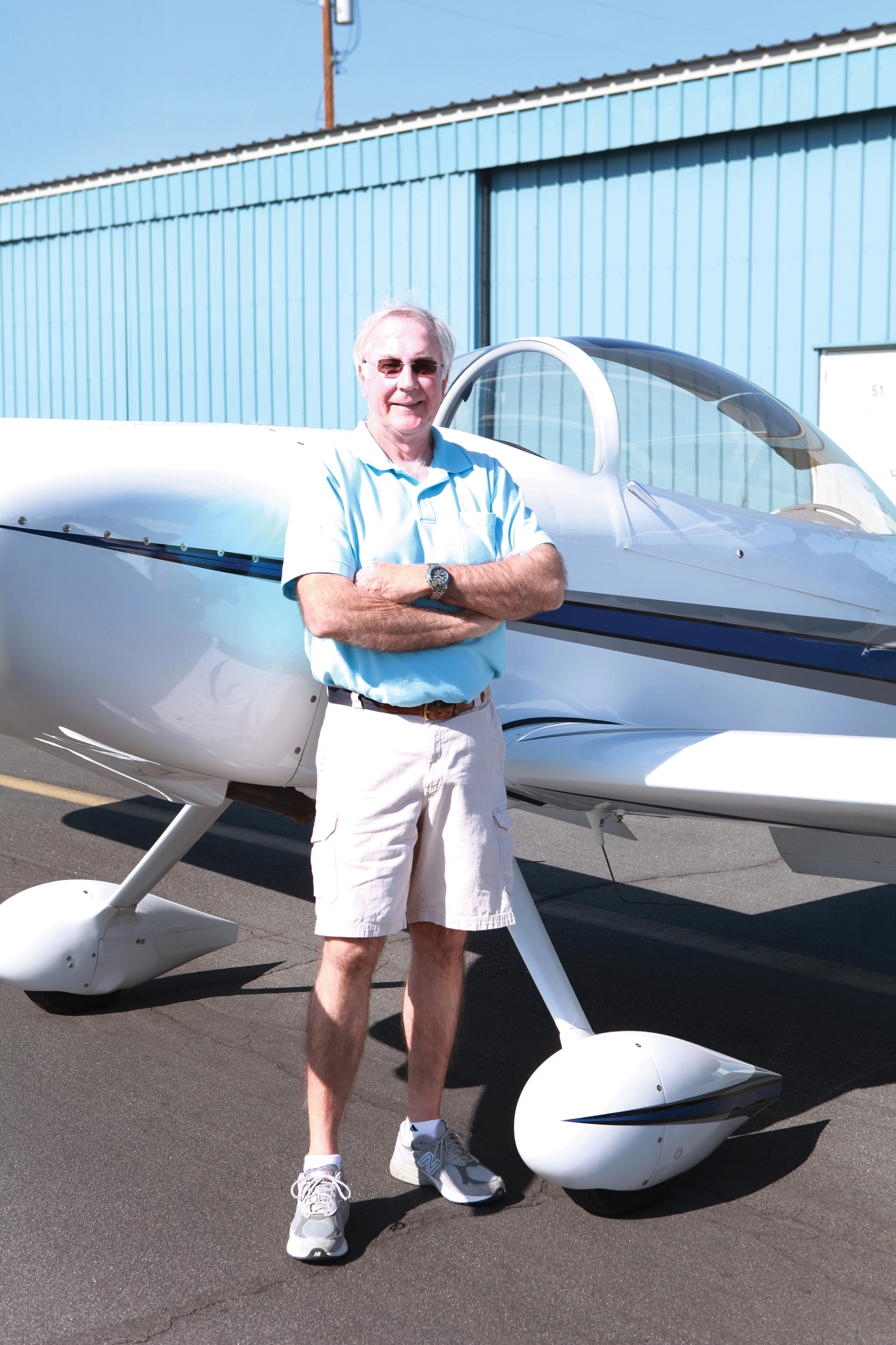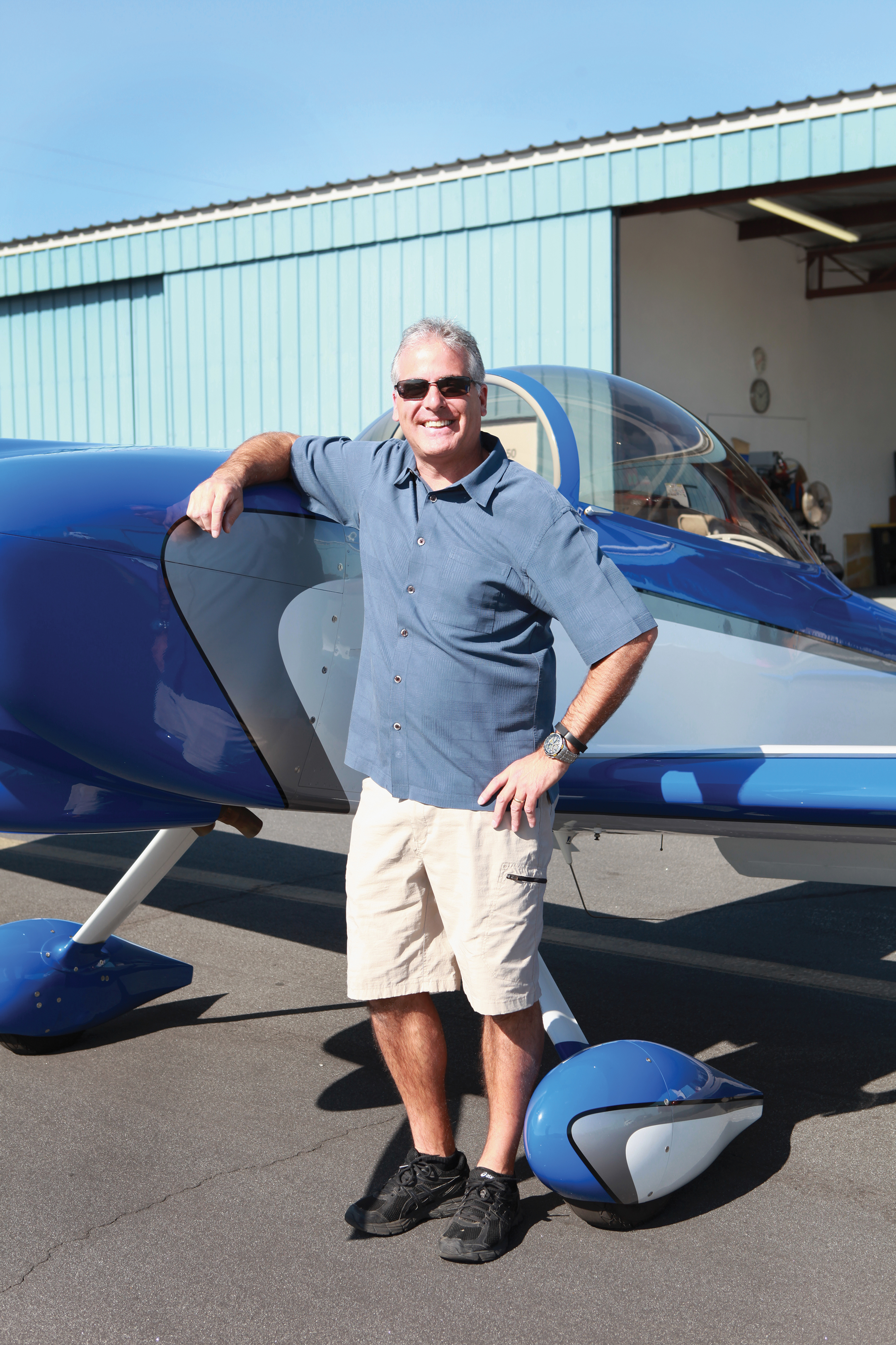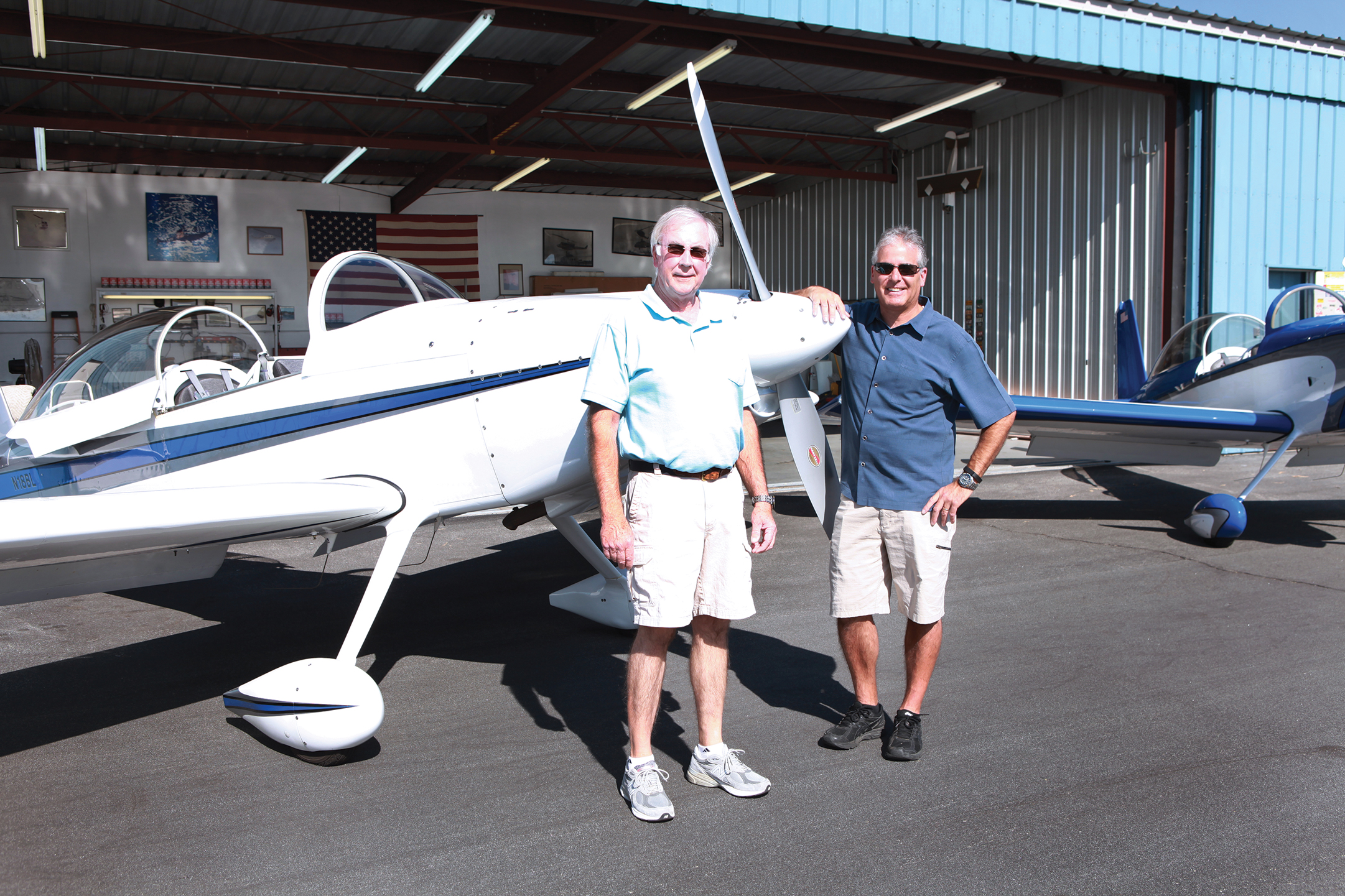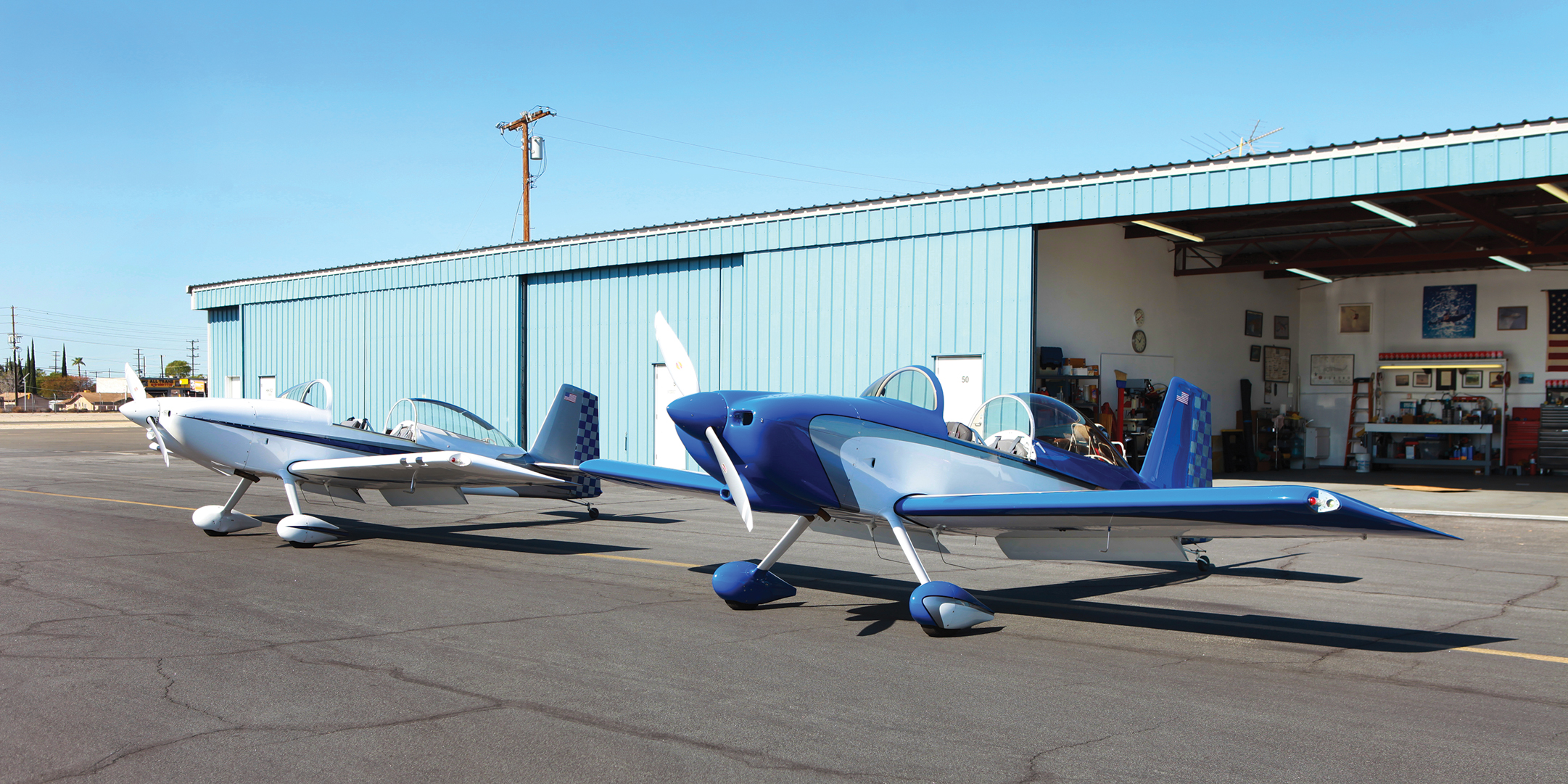 On a warm February morning, heat rose up from the blacktop at Whiteman Airport in Pacoima. Dozens of planes were parked in lines, like birds standing at attention. Hangars lined the football field-shaped parking lot, and a runway lay in waiting on the other side of a chain link fence. In front of an open hangar that proudly displayed the American flag, two white and electric blue tail draggers gleamed in the sun, canopies open.