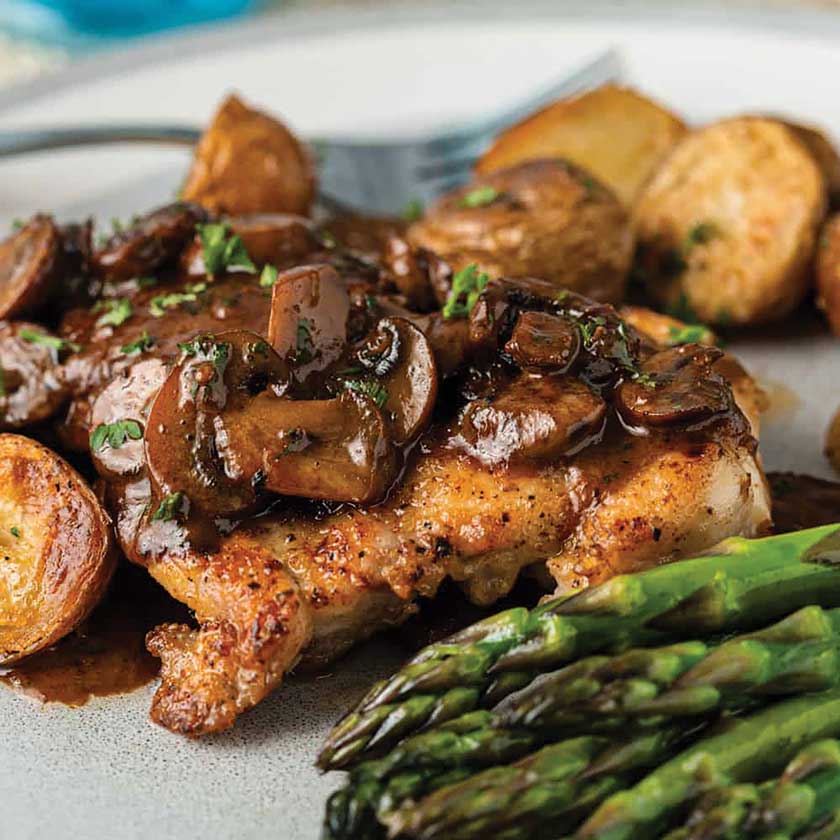 Turn off heat and put cooked ingredients on a plate. Serve with another side such as mashed potatoes or rice if desired. Spoon sauce over chicken and mushrooms and top with fresh herbs if desired.