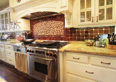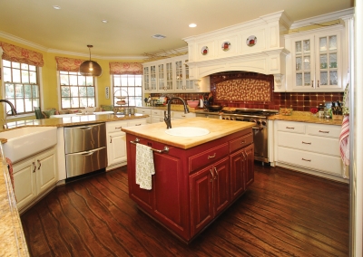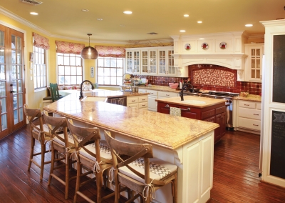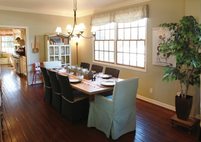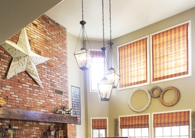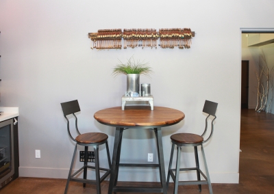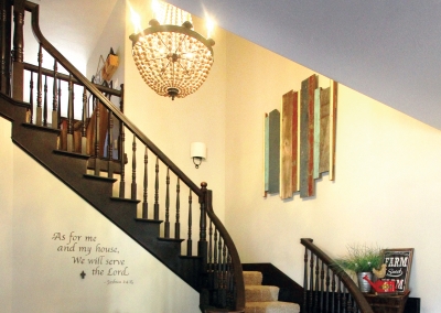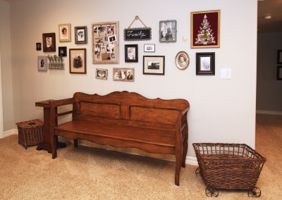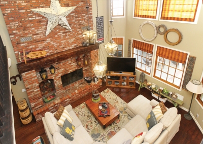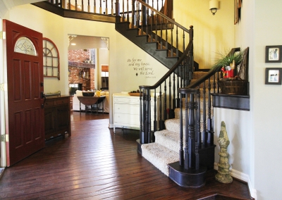 Lori Manthei designed the interior of the home to reflect the farm-like feel of the outside. The living room is impressive but comfortable, with patterns and textures around the room that are both welcoming and cheerful. Lori’s attention to detail throughout the whole house begins in this room where flea market finds, farm inspired pieces, and antiques are creatively displayed to introduce each family member’s interests. Antique furniture is placed throughout the living room and formal dining area, providing both a function and a discussion piece.