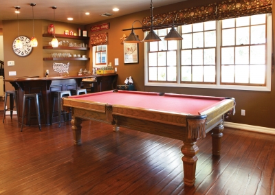 The open family room and kitchen are at the heart of the house, with plenty of natural light filtering in. The large kitchen island and countertops provide an inviting gathering spot for friends and family, and the perfect workspace for Lori and her two daughters to bake. The casual living space opens up to a beverage bar and game room, complete with a pool table for company to enjoy.