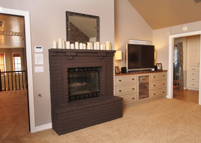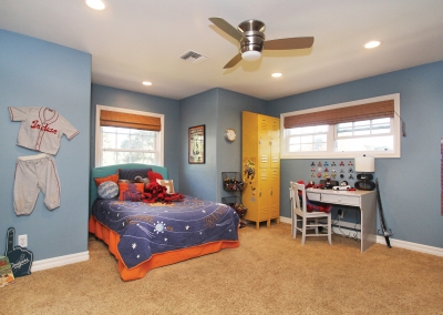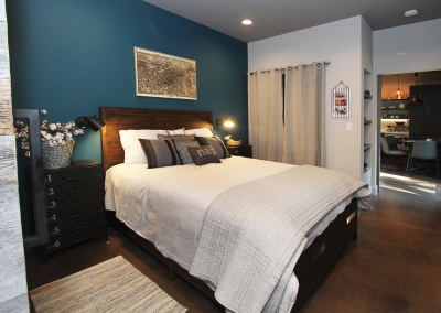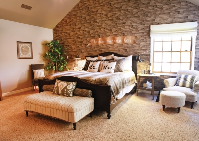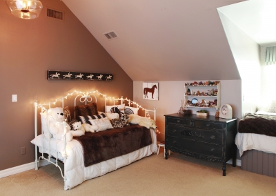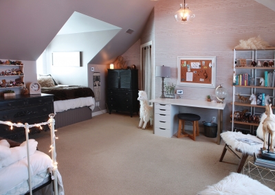 The rustic chic design continues upstairs, where the master bedroom incorporates one of Lori’s favorite decorative elements- textured wallpaper! Wallpaper also adds a whimsical touch to a small loft used by the Manthei’s nine-year-old son as a study area, and friends are even welcome to color on the playful wall decor. All three Manthei children are homeschooled by Lori, and their bedrooms and project room provides them with ample space to play, craft, build and learn!