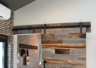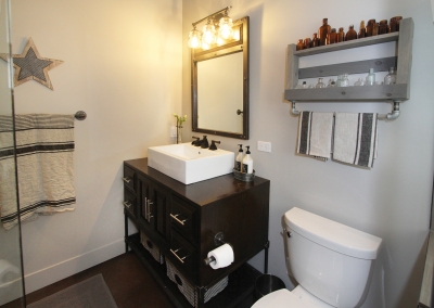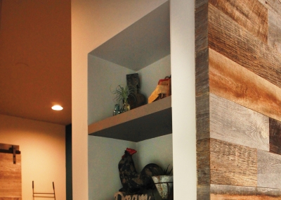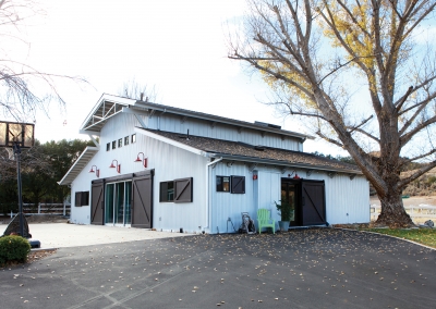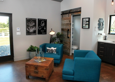 As a music composer for TV and film, Kevin Manthei’s commute to work is a short walk across the yard to his newly constructed music studio. The incredible 2,400 square foot building, is a dream come true for both Kevin and Lori who worked for four years to complete the project. Their sleek studio ties in the modern rustic feel of the main house, with industrial and musical elements. The lounge area has exposed ductwork and custom shelving made with repurposed plumbing pipe. Light fixtures made from roof turbines add an interesting touch, while cassette wallpaper incorporates a fun element to a bathroom enclosed with a sliding barn door.