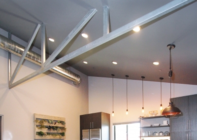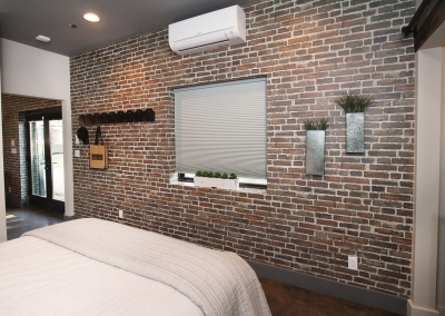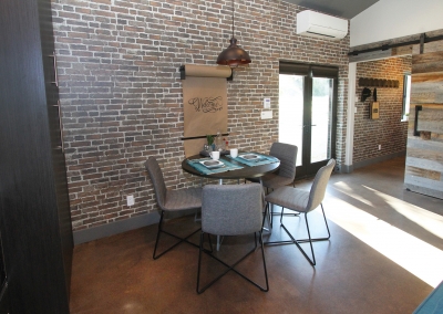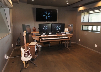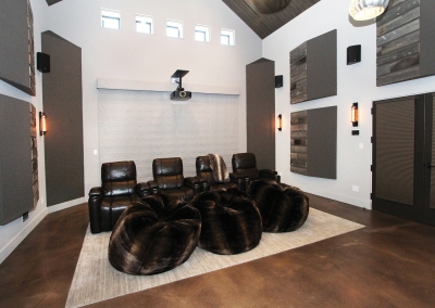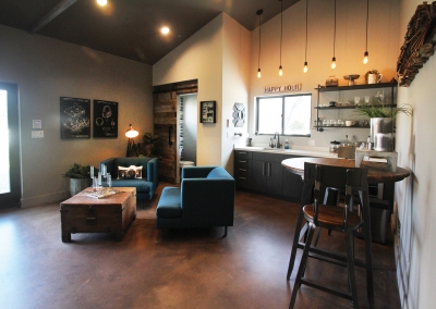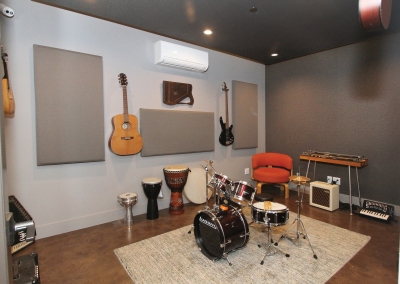There are three recording rooms in this one of a kind studio. The main room was acoustically engineered, and holds a phenomenal custom made desk made from reclaimed wood. The top of the line recording room is fully equipped with ten-foot span windows, acoustic curtains, and everything Kevin and his clients’ need. A larger recording space next to the lounge can accommodate up to 18 musicians. Sliding glass doors allow for large instruments to be wheeled in and out of the space easily. With electronically lowered drapes and a recessed screen, the space also doubles as a theater room for the family. The textured wallpaper that Lori loves was added to the ceiling, giving the illusion of wood planks. Alongside the theater room and on the other side of a sound proof wall is the guesthouse which includes an open concept living, kitchen, dining room as well as a bedroom and bathroom seamlessly continuing the inviting industrial inspired theme. As if that wasn’t fantastic enough, there’s also an additional attic style room upstairs offering more room to compose and create.