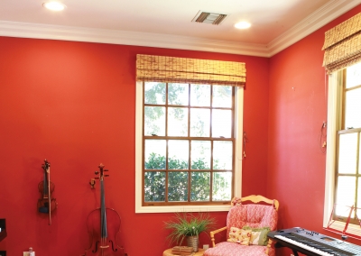 Adjacent to the living room is the music room where the Manthei children enjoy practicing their instruments, while also able to look out the window at the chickens and goats dawdling around outside. Antique instruments adorn the walls, while a piano and other instruments lay waiting for a family jam session.