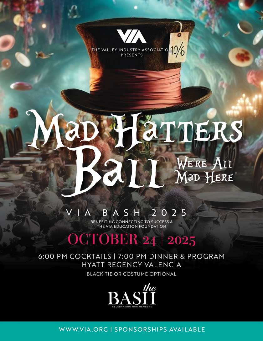 Once a year, something magical happens in the Santa Clarita Valley. This year, on Friday October 24th the Valley Industry Association (VIA) takes a joyful tumble down the rabbit hole to host its signature event—the VIA Bash. This year, we’re trading in the ordinary for the extraordinary as The Mad Hatter’s Ball comes to life in all its whimsical wonder. But don’t let the tea cups and top hats fool you—this isn’t just a fanciful night of celebration. The Bash is where fun meets purpose, and where the community’s heart beats loudest for workforce readiness and future success.