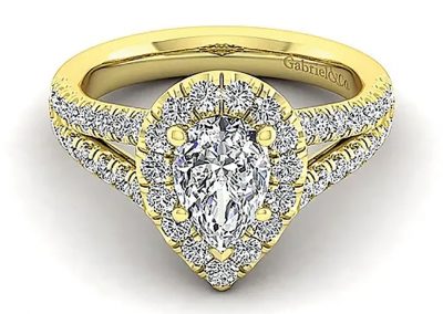 3. Turn heads in the room with this combination of a gold band and striking pear-shaped diamond. Featuring a jewel-encrusted yellow gold ring band, this piece flaunts style and grace, and all eyes are drawn to the front-and-center diamond From its unique diamond shape to the colored band, everything about this ring radiates classiness and sophistication.