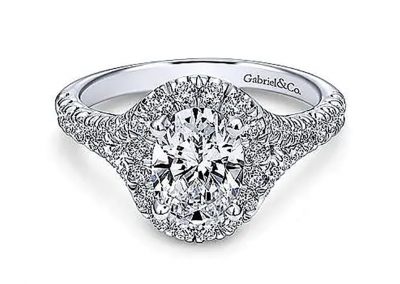 5. Get back to the basics with this elaborate collaboration between an oval-cut diamond and a stunning halo. Though the highlight of this piece is undoubtedly its dazzling diamond, your bride will be mesmerized by the effortless allure of the jewel-lined white gold band, and for those feeling a bit more bold, the option of a yellow or rose gold band is available to ensure that your ring is set her apart from the rest.