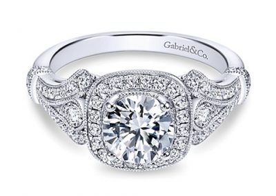 Vintage 14k White Gold Round Halo Diamond Engagement Ring – In this engagement ring, a glamorous diamond halo center stone is accented by ornate vintage detailing, reminiscent of the glitz and glam of the jazz era.