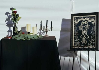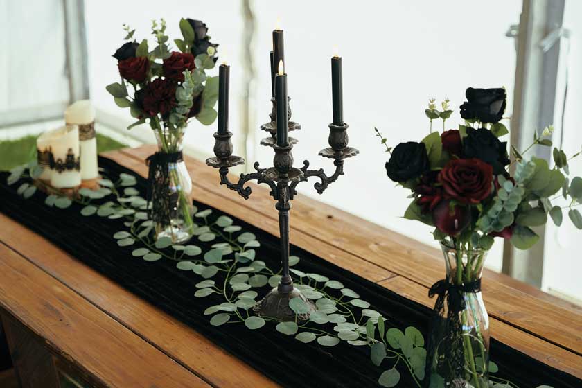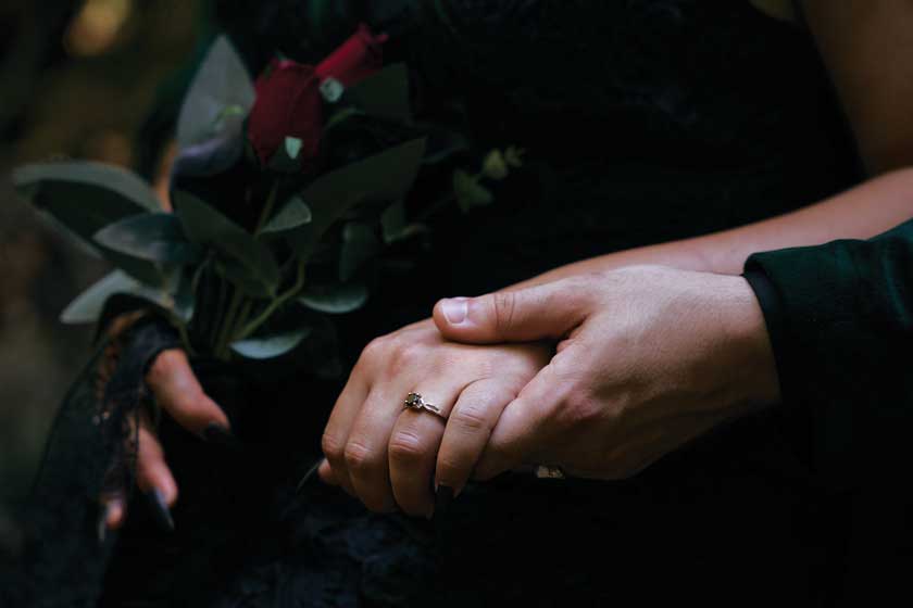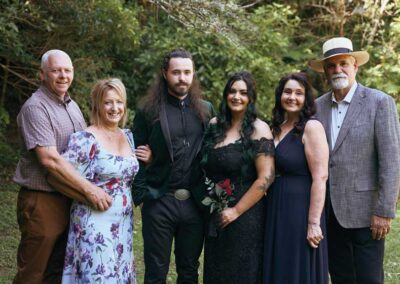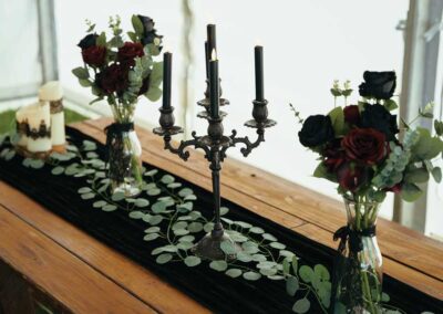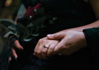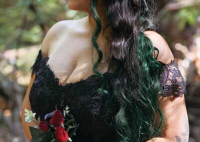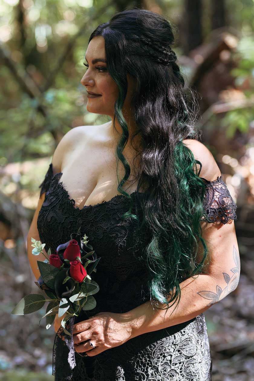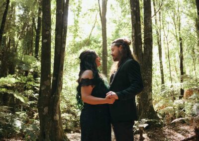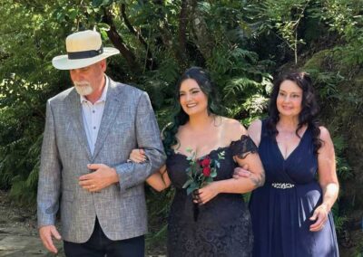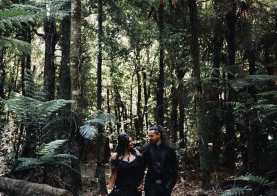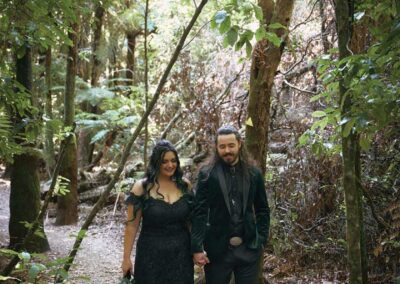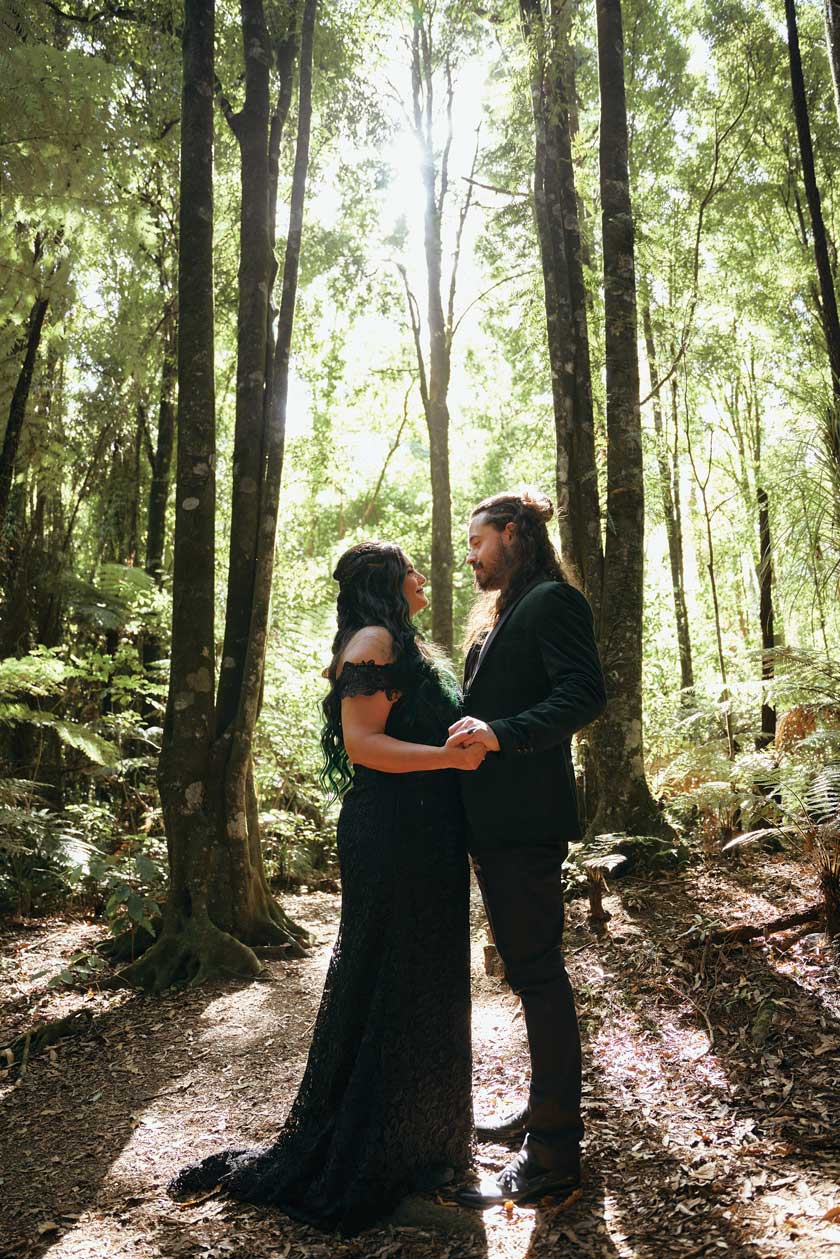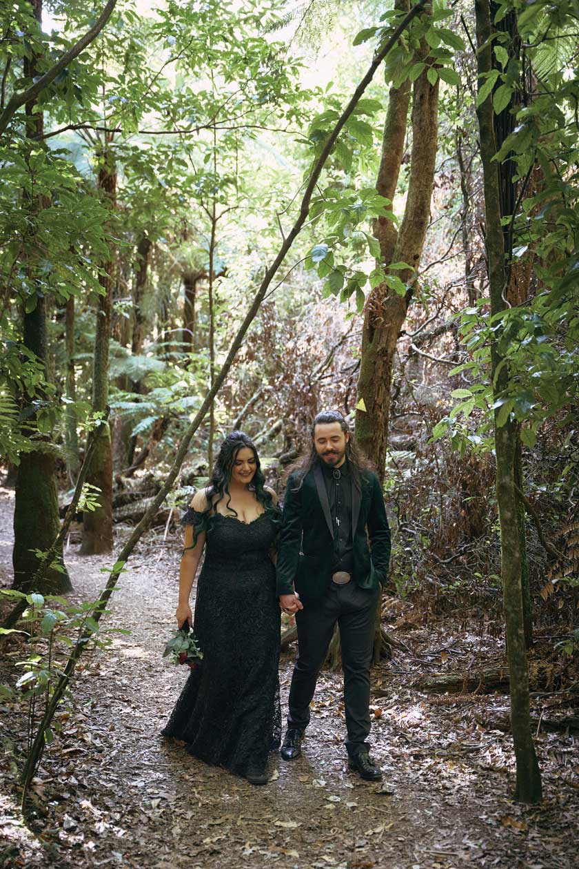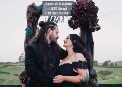 For their wedding, Ginger and Louie embraced a non-traditional, gothic-inspired style that reflected their personalities perfectly. The ceremony was officiated by their dear friend Tyler, who, fittingly, is also their Dungeon Master in Dungeons & Dragons. As the mastermind behind the planning and florals, Ginger ensured that every detail came to life just as she had envisioned. Chic Beauty’s Kylie from Tauranga took care of both her hair and makeup, while Bluebells Cakery crafted a stunning cake to complement the celebration.