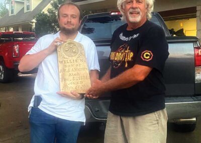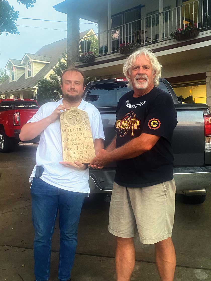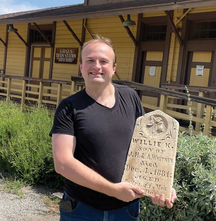 Getting the headstone home became Mock’s quest. As fate might have it, a former COC archaeology student Brandon Kimball, who moved to Texas after graduation, saw the social media exchanges and reached out to the Historical Society, offering to bring the headstone back to the Santa Clarita Valley.