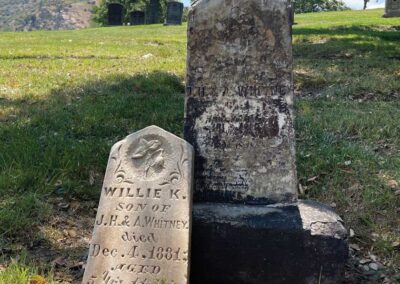 The 27-pound marble stone that measures 9” X 17”, bears a carving of a flower with a broken stem above the words: “WILLIE K., SON OF J.H. and A. Whitney. Died Dec. 4, 1881; AGED 5 Yr’s, 11 Mo’s, 18 Dy’s.” The stone is broken below the last line.