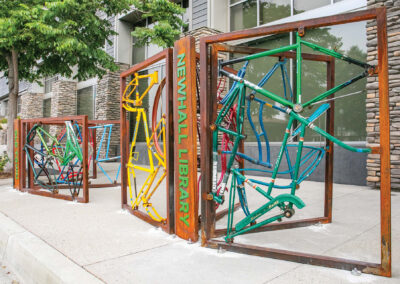 California Scape, located at Fair Oaks Park, is by the artist team Forma Studio and is an interactive sculpture that reflects the natural landscapes of the Santa Clarita region. This piece provides the community with a space to reflect on nature and its calming effects. The sculpture’s dynamic and fluctuating geometry allows for park-goers to lounge in the curves and offers a connection to its surroundings as it has a tree growing into the design.