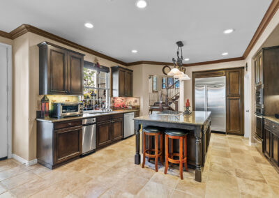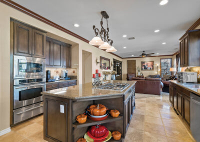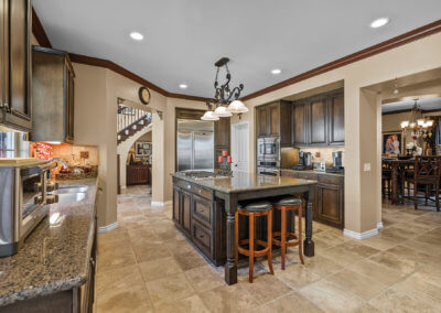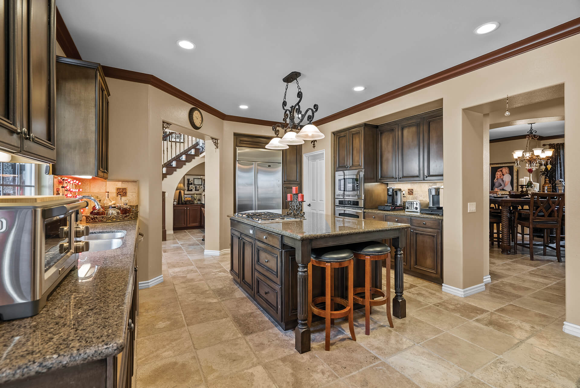 To the right of the family room is the kitchen. It has stainless steel appliances, dark wood cabinets and plenty of granite-topped counter space. It’s a welcoming space for friends and family to hang out.