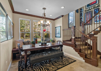 When you walk further inside, you’ll enter the family room where a family gathers to socialize and watch movies. This room, which is surrounded by windows, continues with warm earth tones and dark wood.