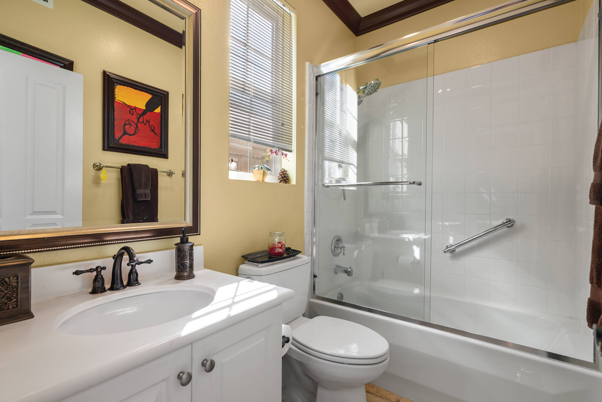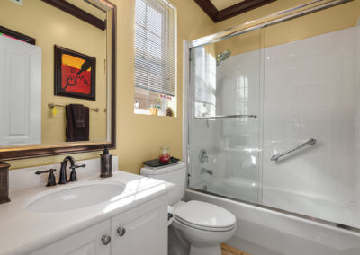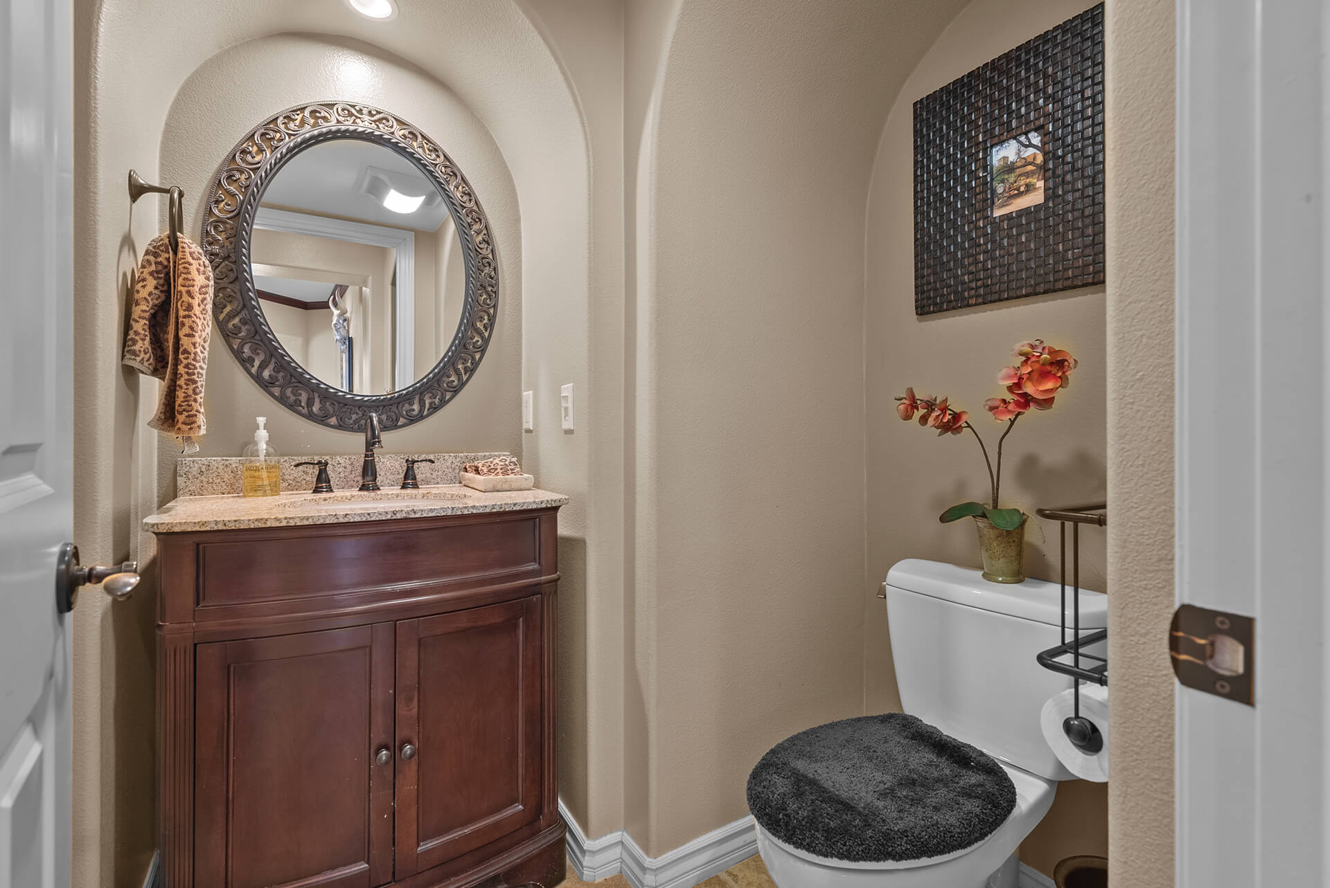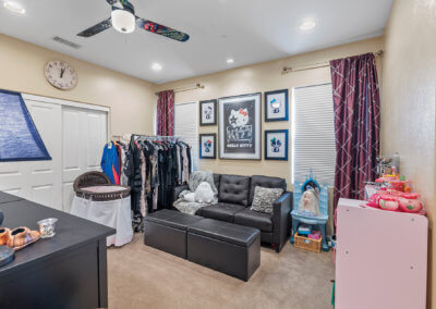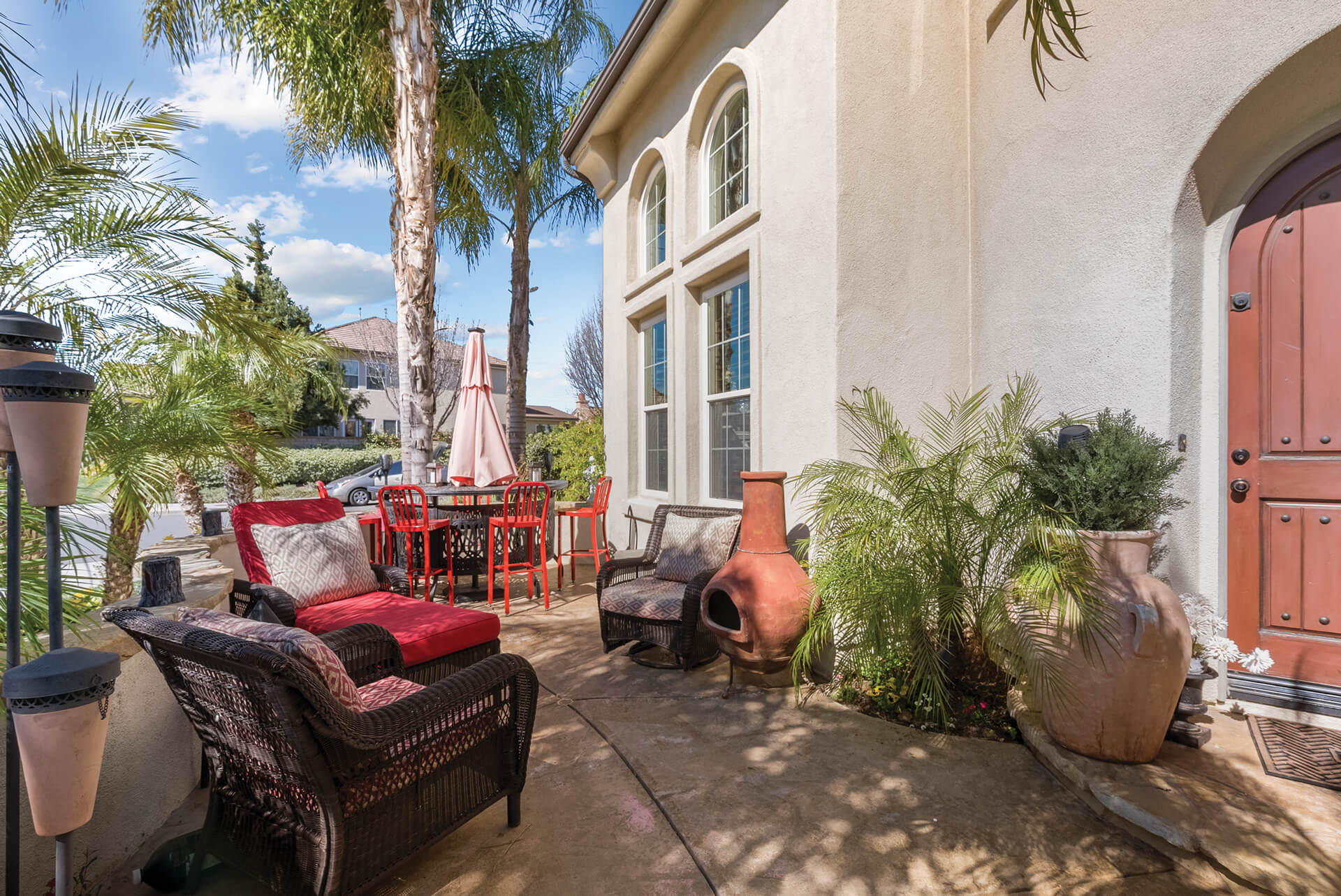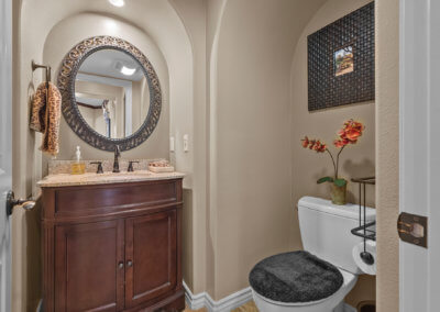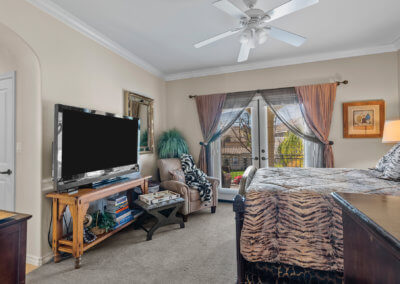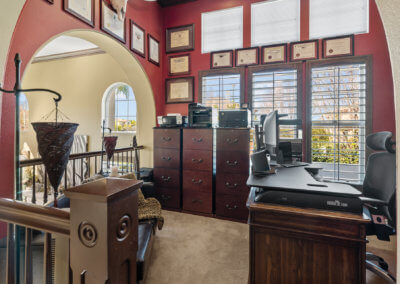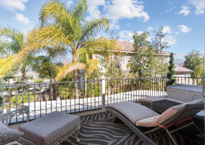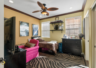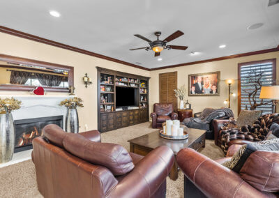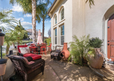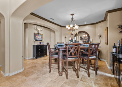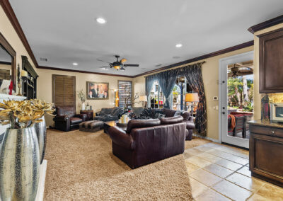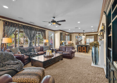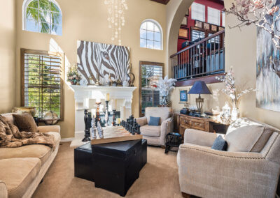 Walking up the driveway, you’ll encounter a cozy front patio that is shaded by palm trees and decorative umbrellas. This is the perfect place to hang out while listening to the subtle sounds of trickling water from the fountain and sipping on adult refreshments in one of the comfy lounge chairs. As you walk into the home, your eye is drawn to a stunning crystal chandelier suspended from a two-story ceiling. It hangs over a large chess board in the middle of the room. The room is painted in warm earth tones with animal print accent pillows. It has its own fireplace, and it receives abundant light through giant windows equipped with plantation shutters.