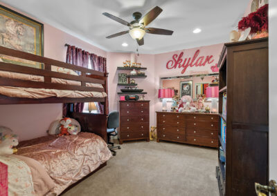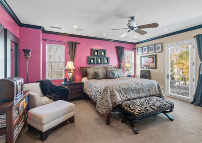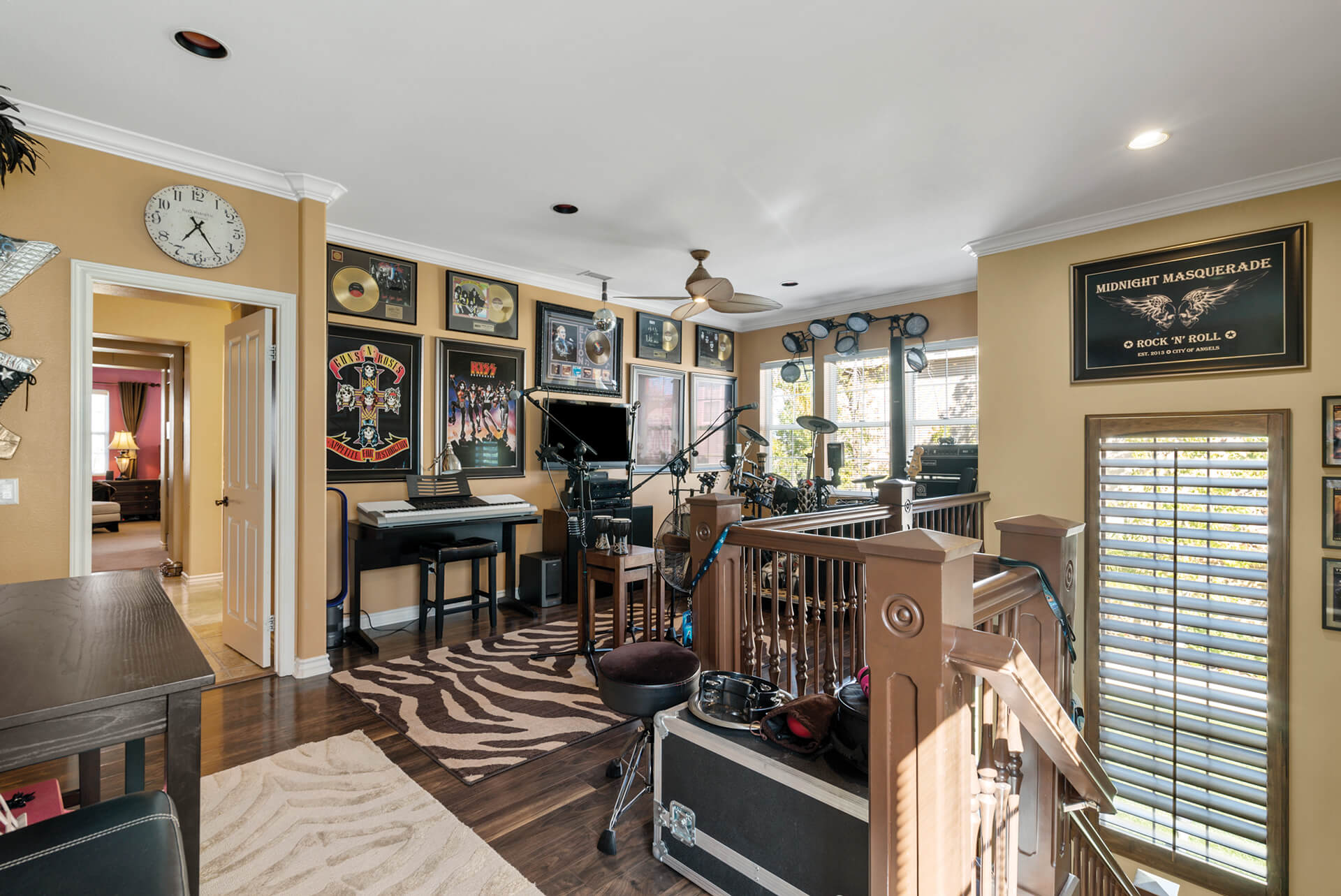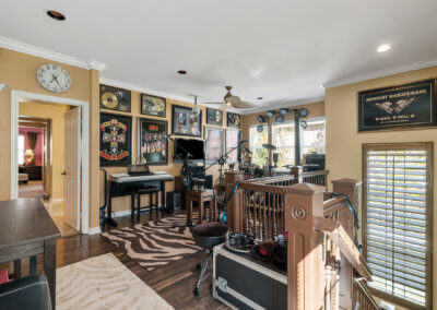 As you ascend the back stair, you’ll notice the two-story walls are adorned with all manner of rock and roll memorabilia. At the top of the stairs, you’ll enter the loft space, which is currently used as a music studio. Continuing one way from the music studio, you’ll enter a hallway that leads to three bedrooms that are spacious for growing children or office and gym space. Continuing the opposite way from the studio, you’ll enter the master suite.