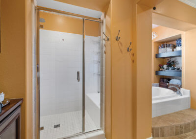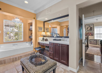 Upon entering the master suite from the studio, you’ll find the master bath with stone floors throughout. It is equipped with his and her sinks, a makeup counter, large soaking tub with a crystal chandelier overhead, a separate walk-in shower with seating and large walk-in closets.