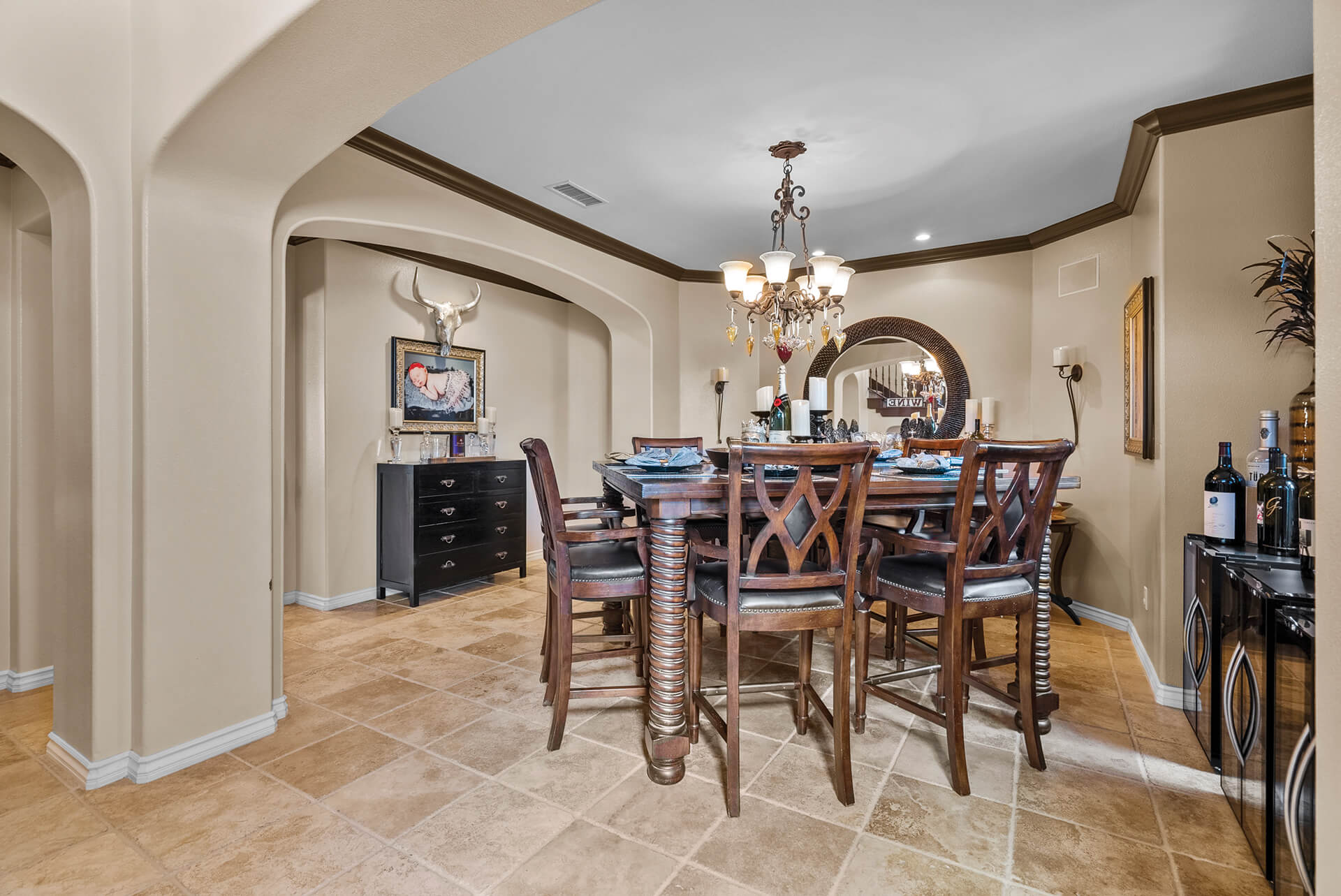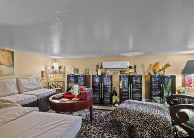 Across from the wine cave, you’ll find the dining room. What would dinner be without a glass of wine or two? This room is made to be an adult hideaway with more wine refrigerators lounging furniture and more. Just lean over to grab your favorite vintage.