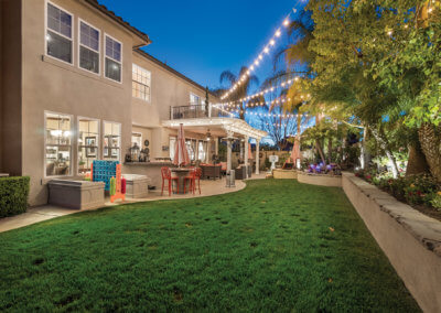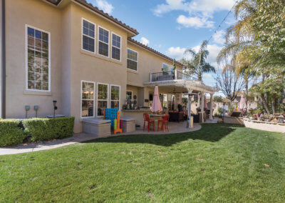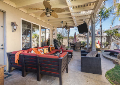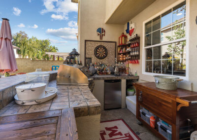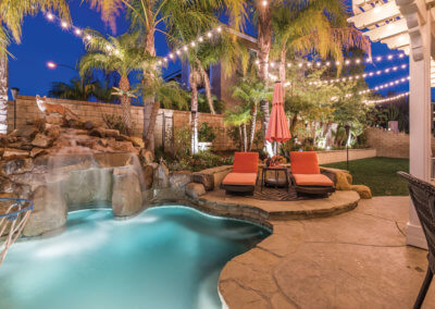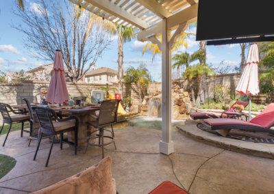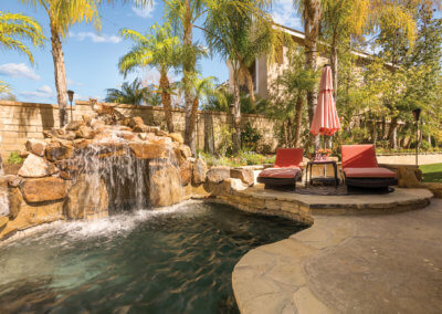 The backyard is ideal for entertaining as it is shaded by large trees. Upon entering the yard, you’ll find a bar-b-que island with refrigerator and wet-bar to the right. To the left, you’ll find a covered seating area with outdoor television. Any family who loves spending time in the “spool” (larger than a spa but smaller than a pool) this is the house for you! The spool has a rock waterfall with a grotto-like cave underneath, and you can actually swim through the waterfall into the cave, which has built-in seating.
