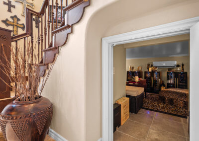 Underneath the front stair, the home has a secret wine cave. Don’t let the small opening fool you. Inside, you’ll find a sectional sofa, wine refrigerators and a flat-panel television.