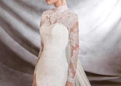 Modesty and class combine to form the traditional high-neck wedding dress that has grown increasingly popular within the last few years. With the option to include sleeves or go sleeveless, the mock neck style of these dresses give the bride many avenues for customization, and this style in particular allows the bride to show off her collarbones and shoulders without having to opt for full gown sleeve.