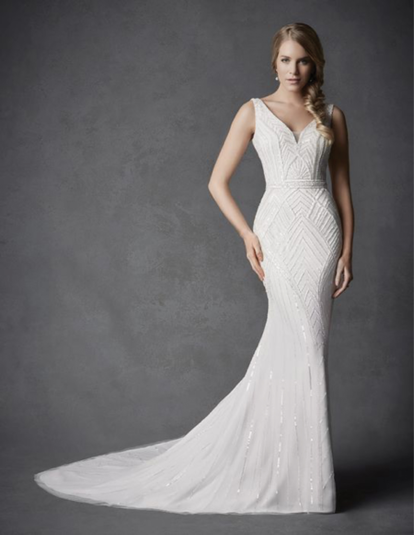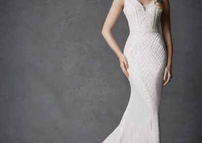 Popular among tall and petite women alike, the sheath-style wedding dress features a more conservative shape, flowing more freely towards the bottom of the bride’s figure. This style of dress offers more freedom of movement in comparison to the mermaid-style dress, and is popular as a result of its form-fitting shape and infinite capacity for customization. This type of dress is ideal for those who desire the allure of a form-fitting dress, but would prefer a more natural or flowy train as the dress reaches the floor.