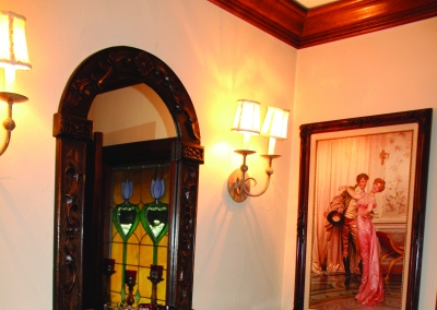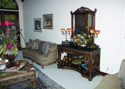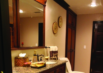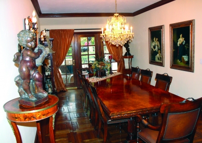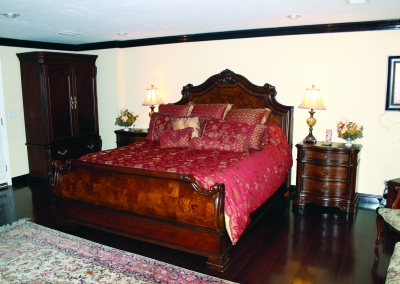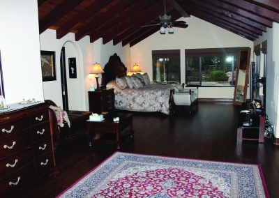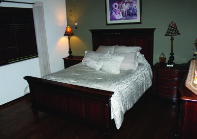 The third master suite is located at the far end of the house. It is separate from the rest of the rooms and is located right off the great room. The room is accented with ebony floors and gold fixtures. The shutters allow for warm lighting to tiptoe in during the day. The bedroom has its own private ¾ bathroom equipped with a sauna and a bidet. With its private entrance and elegant-look it is ideal for an in-law’s quarters or guest space.