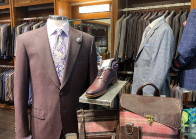 Sometimes during Summer, you may need to dress up formally whether it be a business meeting or special event. JDavid’s can create the perfect custom look that suits you. For example, here we have a very elegant dark purple suit that is paired with a light purple shirt and a floral tie with some greatly matched shoes and some fun and crazy socks. When going formal it doesn’t always mean you have to go with a black suit and dark features. As far as accessories we feature a pair of cufflinks that are made out of a football. And throughout the years bags have become more and more popular for men. We featured two different styles of bags to complete the look.