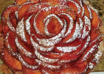 • Spread peach preserves on top of crust in the bottom of pan. Add peach wedges starting from the outside and moving in a circular pattern until filled in.