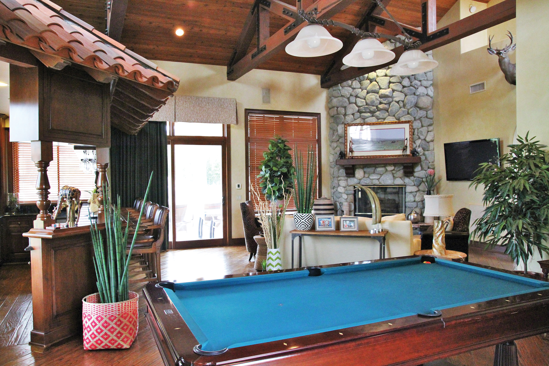 The billiard room has a dark wood A-Frame, loft style ceiling, full bar and corner fireplace to enjoy a cocktail. Large picturesque windows and sliding doors opening to the backyard makes this cheery room the perfect place for fun and fellowship with friends and family.
