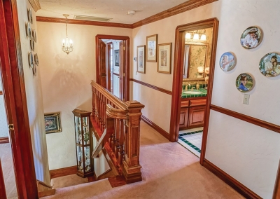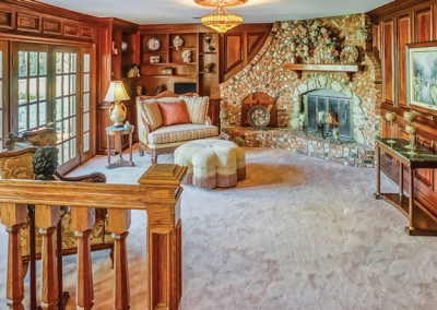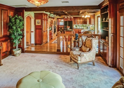 In the family room, Mahogany built-in bookshelves and wood finishes, and an elaborate brick fireplace surround encourage guests to linger. Beveled French doors lead to the patio. Finishing off the first floor are a powder room, laundry area, linen storage, and several closets.