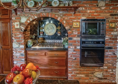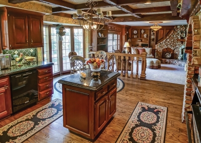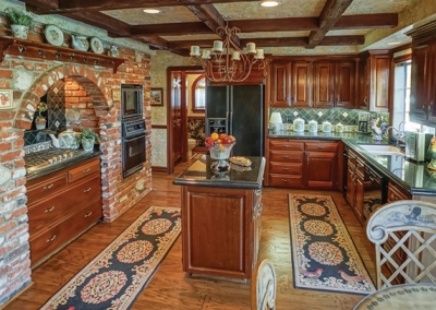 The remodeled gourmet kitchen includes a Viking range, complete with arched brick surround and custom decorative tile backsplash, Black Galaxy granite countertops, a stunning coffered ceiling with recessed lighting, and beveled glass in the breakfast nook. A Mahogany pantry, island, cabinets, and drawers provide excellent kitchen storage. A dishwasher, garbage disposal, oven, microwave, and refrigerator are among the usual amenities.