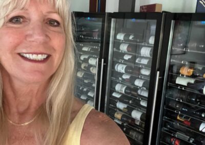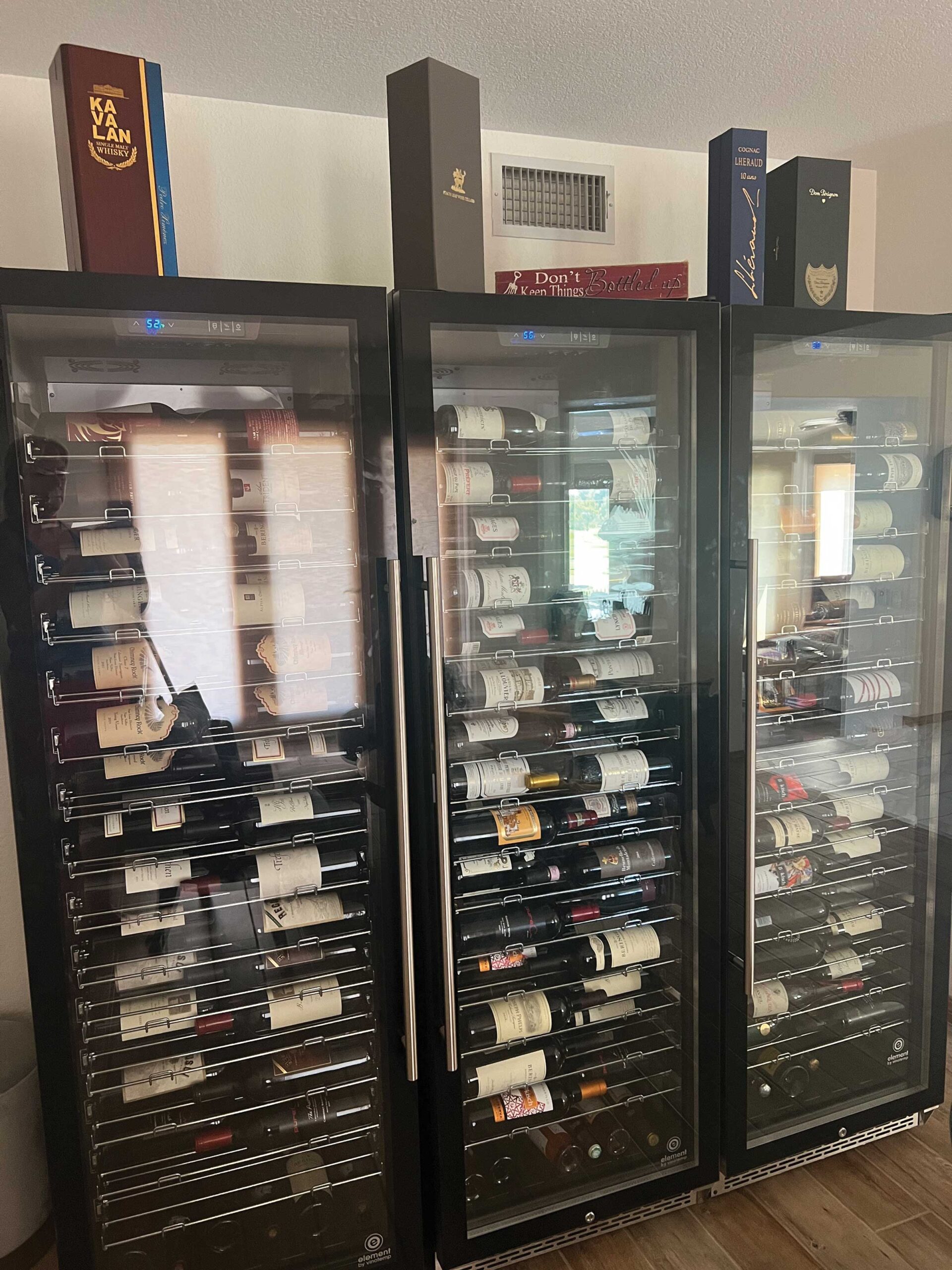 Now, for your larger collectors, with a hundred or more bottles to store. We’ve been very lucky with the Vinotemp chillers. When we didn’t have the space in our home, we got a commercial looking one with no glass or pretty lights. We kept over 400 bottles in a chiller in our garage successfully, insulated with Styrofoam (the ones that your bottles come in when shipped) on the outside, for many years. But it wasn’t ideal. Not only did our collection hide in the garage, but it also took a few minutes to get out there to select a wine on a sometimes-nightly basis. We listed every bottle in a computer program, numbered the rows to find them, and then would scratch off a bottle from the list every time we took one out.