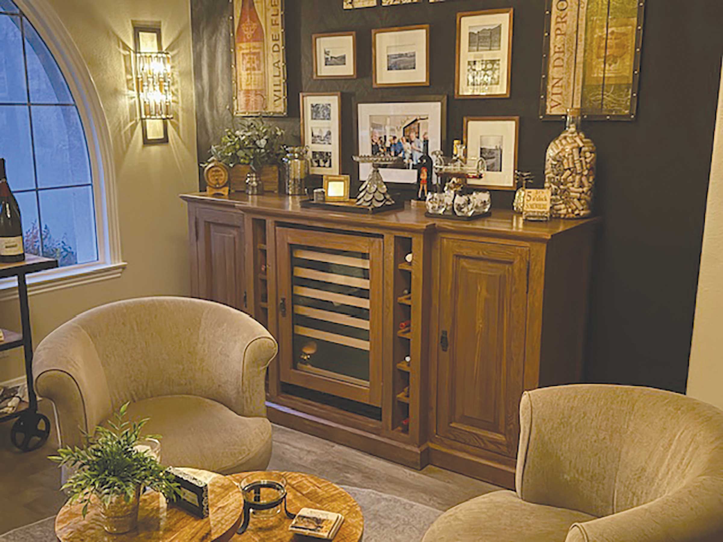 And the one we had to have: The Wine Room – as we like to call it – with a circular table and comfy club chairs, surrounded by wine chillers, wine decor and glassware. (See photos of the Chegwins’ Wine Room – our inspiration.)