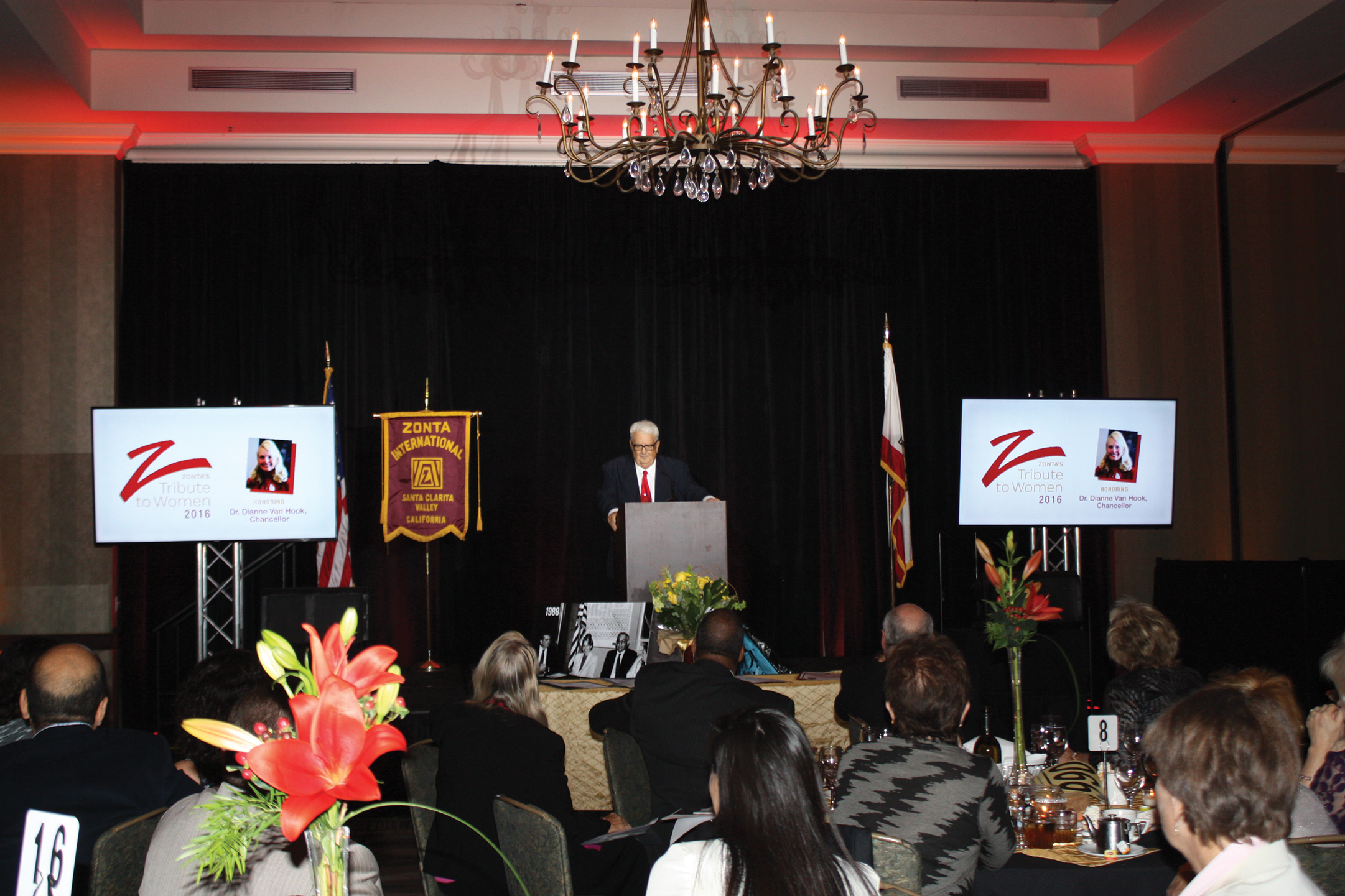 Zonta Tribute was an evening of passionate inspiration as the women-empowerment club recognized the outstanding work of College of the Canyons Chancellor Dr. Dianne G. Van Hook. Festivities kicked off with a cocktail hour for some of Santa Clarita’s finest leaders. The program featured a light-hearted video chronicling Dianne’s life followed by speakers, including keynote Roger Van Hook. Roger shared a hilarious series of anecdotes about life with Dianne, finishing with some heartfelt words to his wife and one final ribbing. Dianne’s speech focused on the power of one individual, the importance of driven women, reaching for your dreams and believing in yourself. When she finished, the entire crowd filling the Hyatt Regency Valencia ballroom was brought to its feet for a standing ovation. The entire community recognized the power of one.